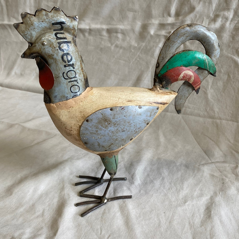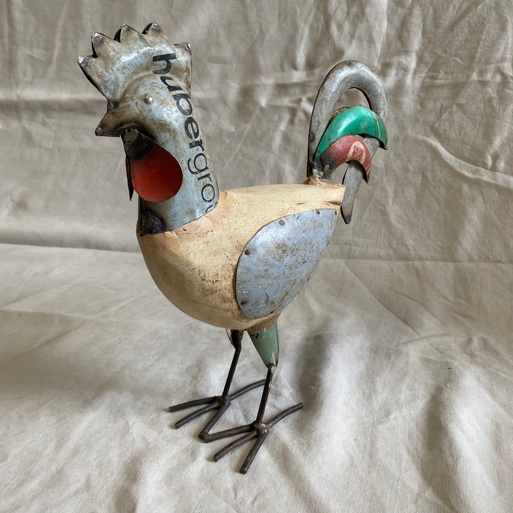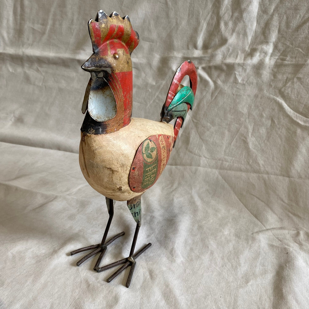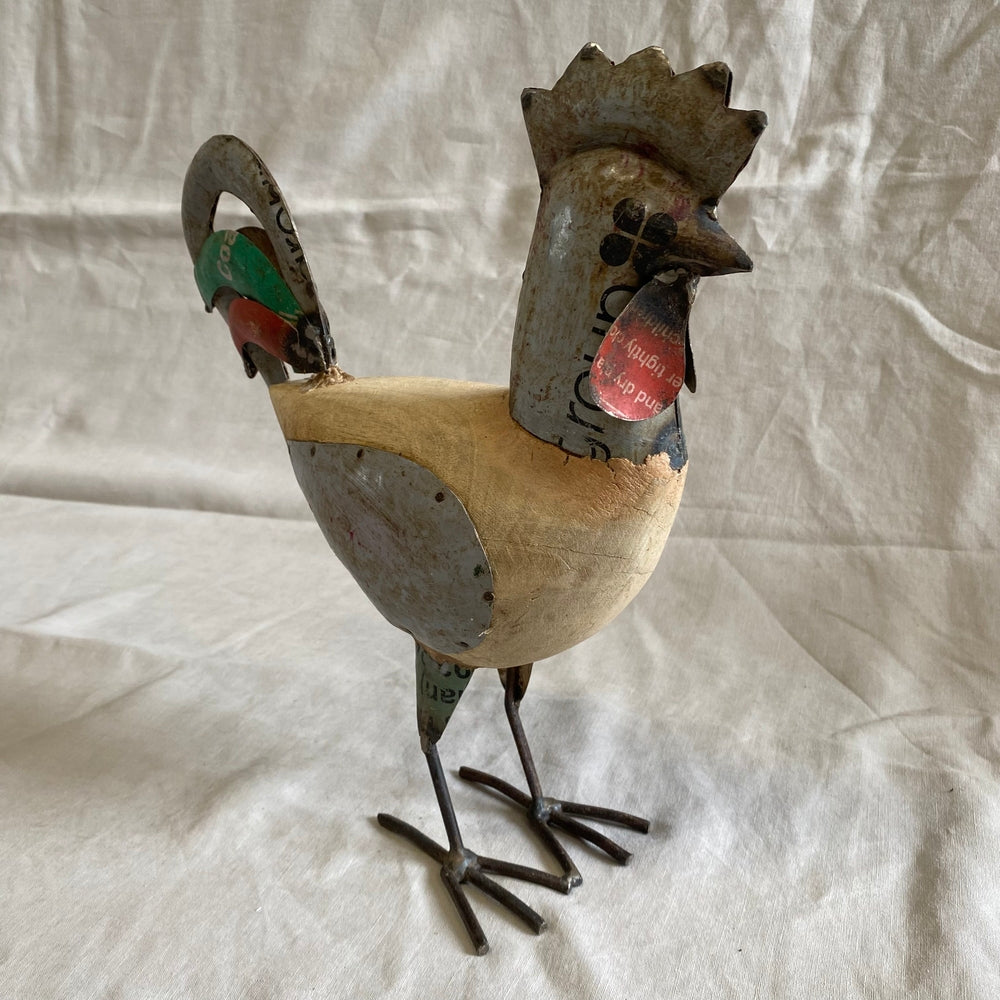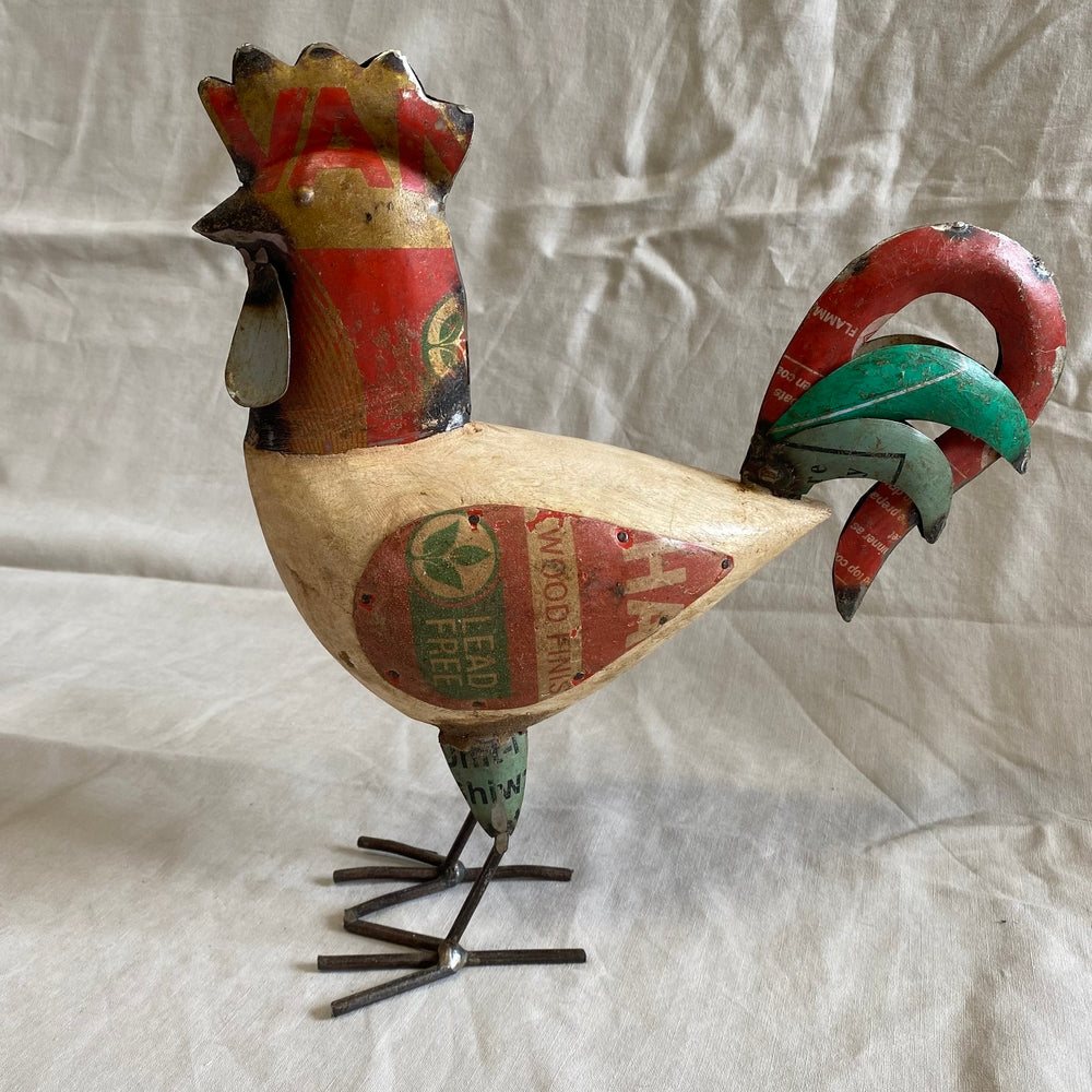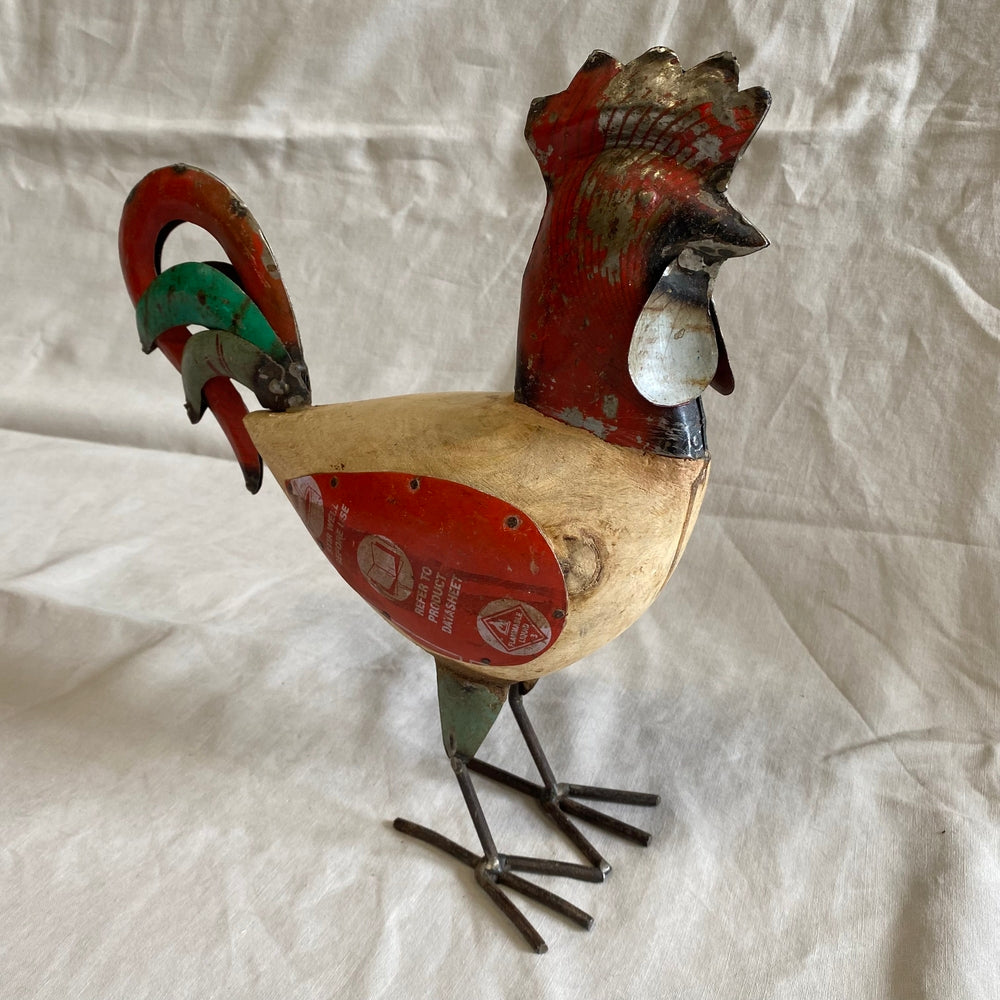 Een charmante haan, handgemaakt van gerecycled blik en hout. Een speels detail met karakter, vol kleur en ambachtelijke eenvoud.