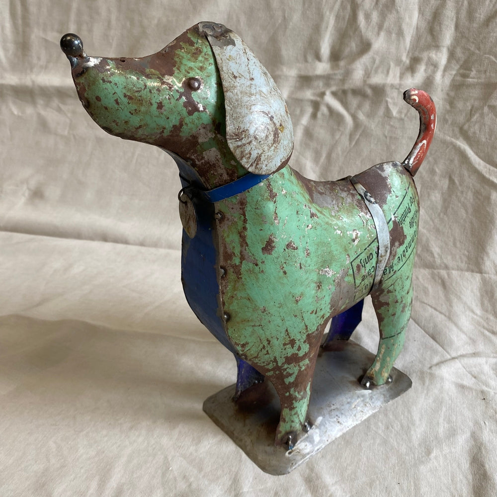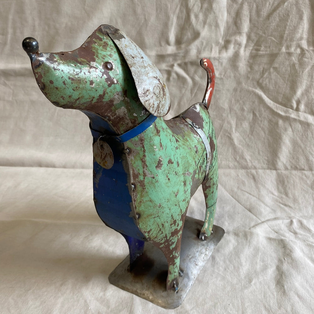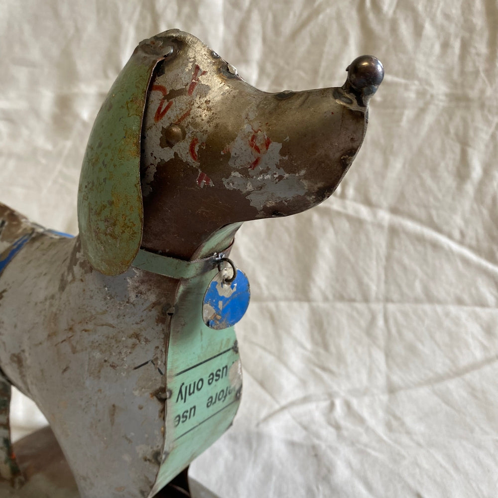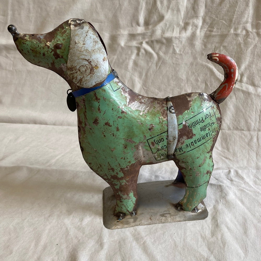 Een speelse hond van gerecycled blik, handgemaakt en vol karakter. Kleurrijk, uniek en met een knipoog – een vrolijke toevoeging aan elk interieur.