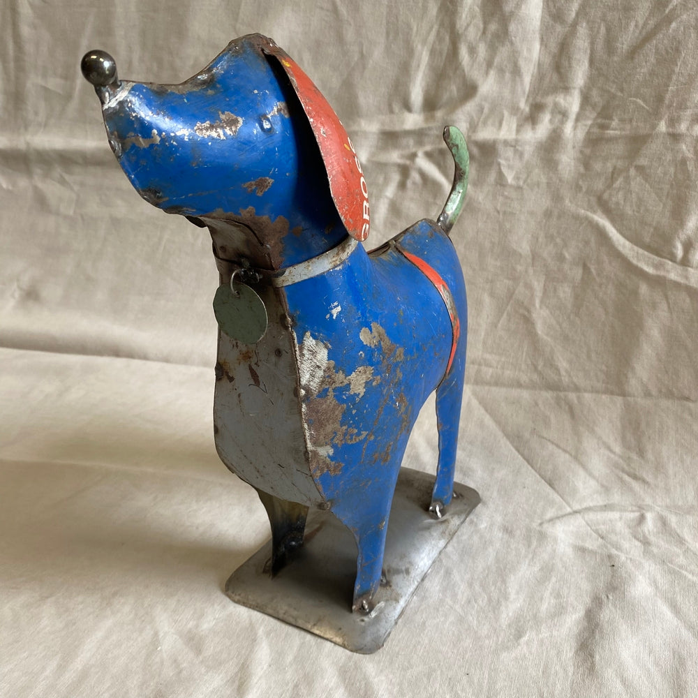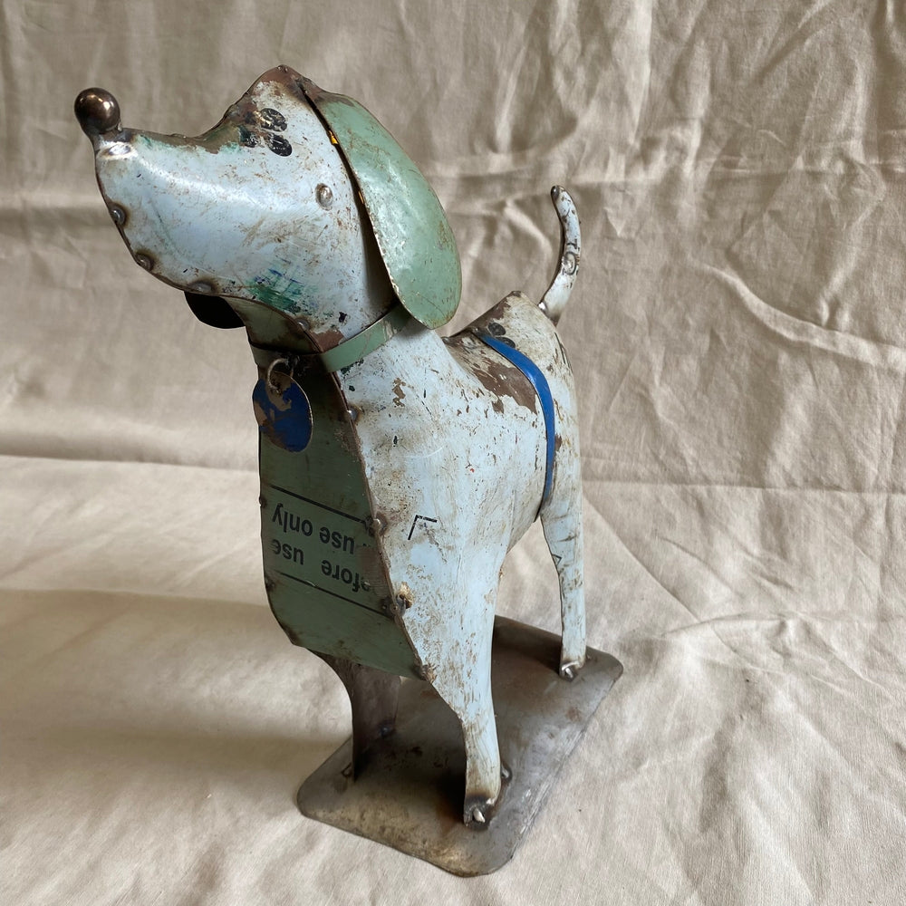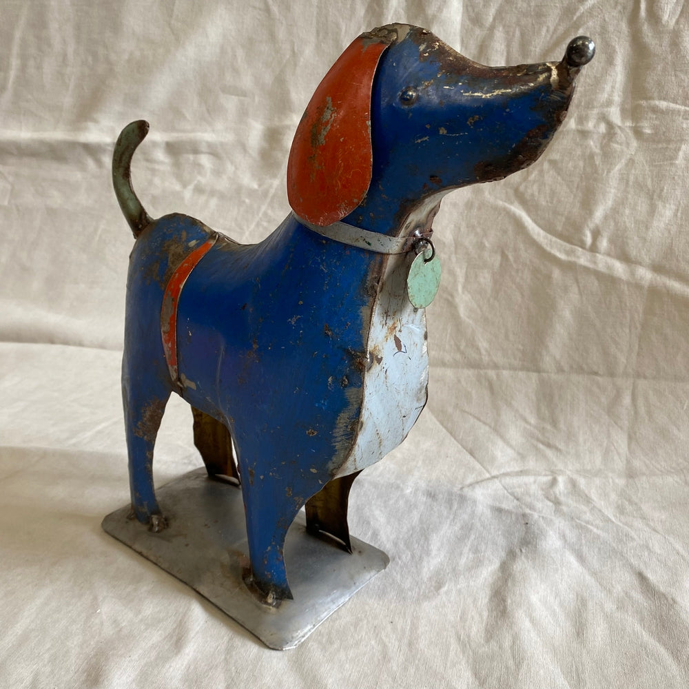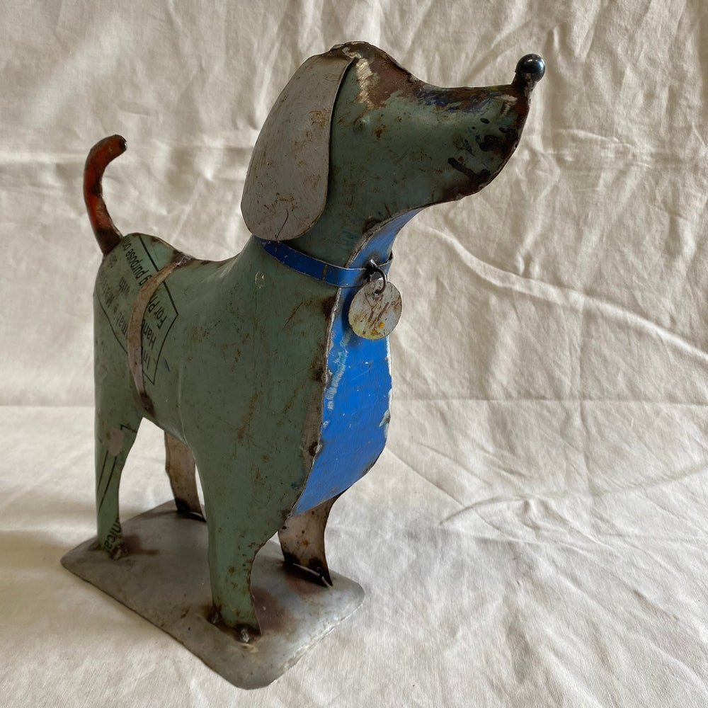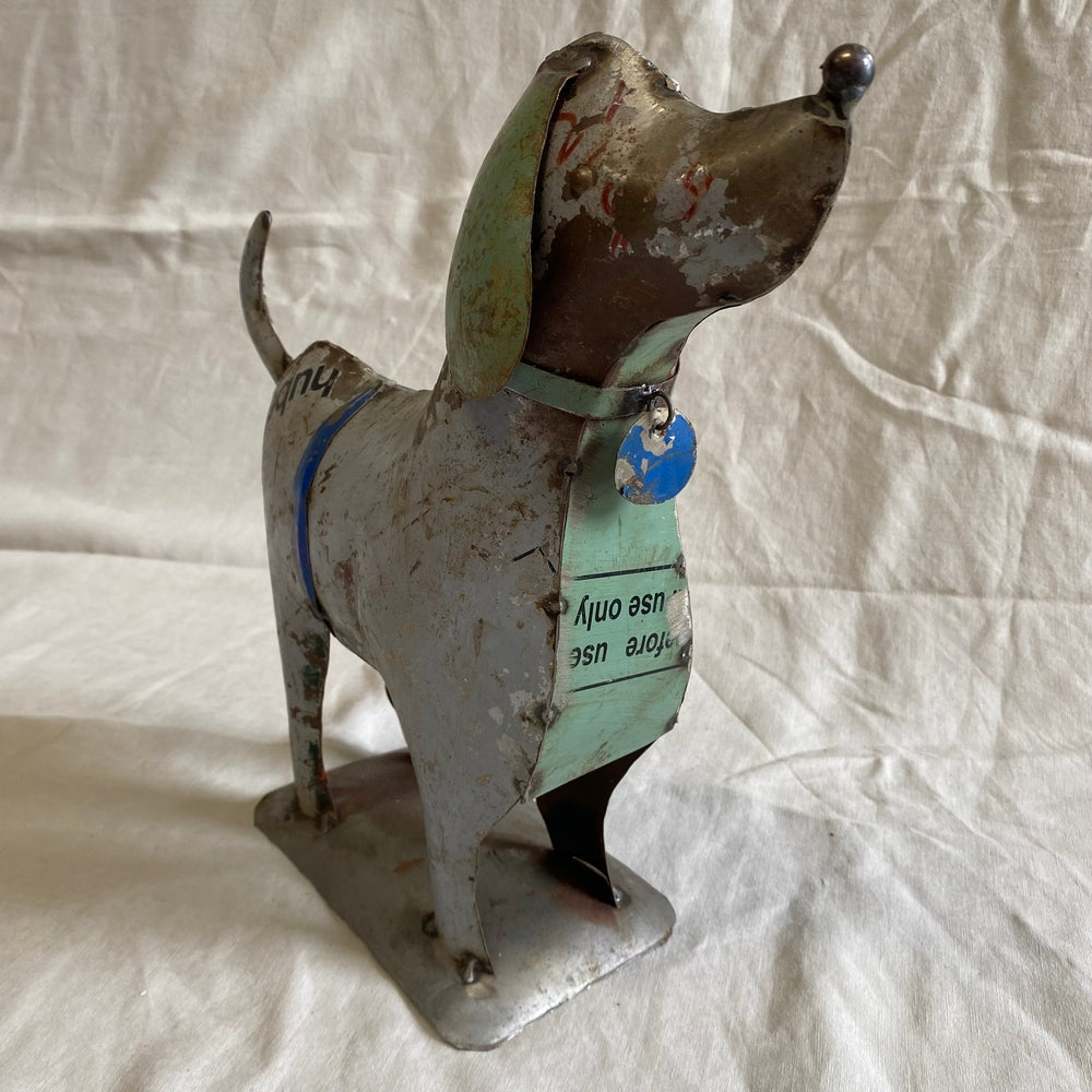 Een speelse hond van gerecycled blik, handgemaakt en vol karakter. Kleurrijk, uniek en met een knipoog – een vrolijke toevoeging aan elk interieur.