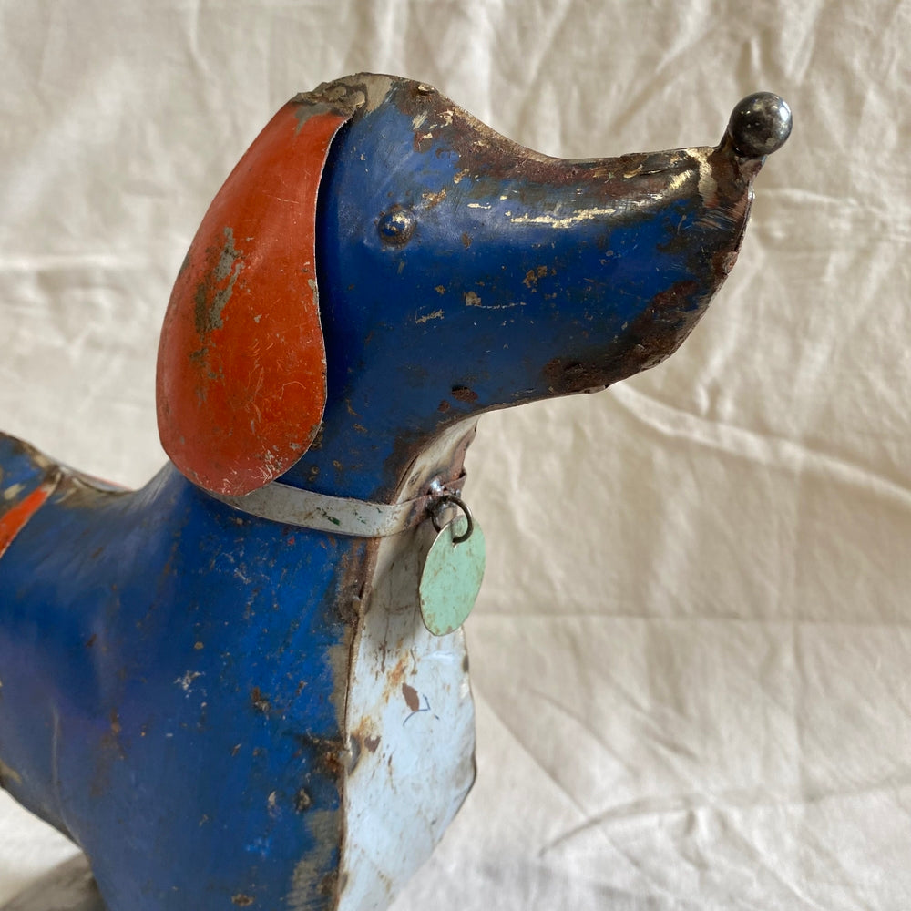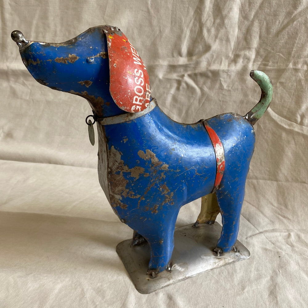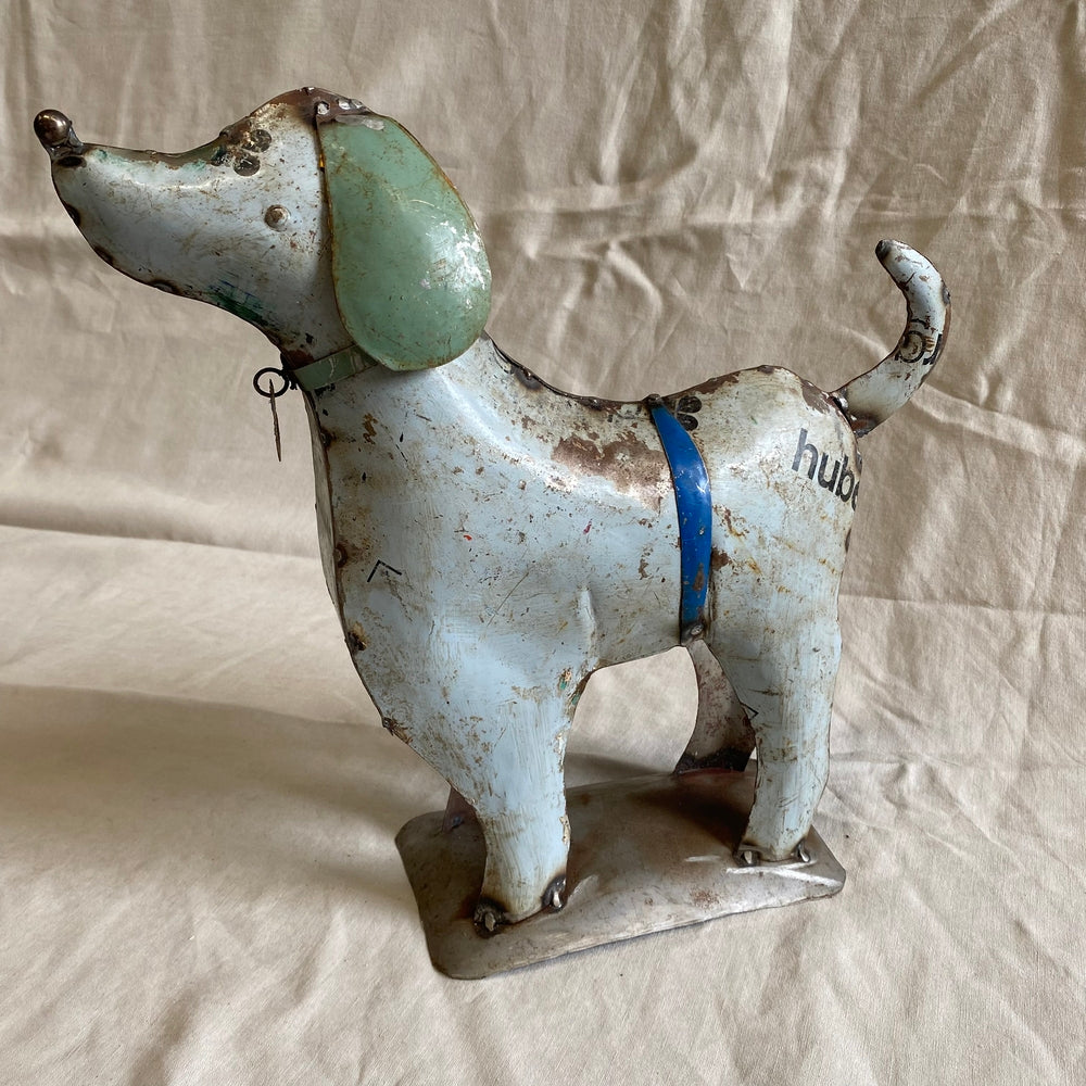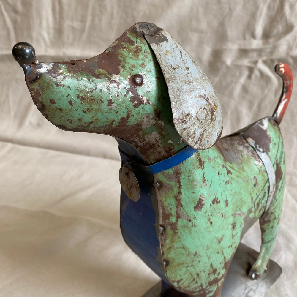 Een speelse hond van gerecycled blik, handgemaakt en vol karakter. Kleurrijk, uniek en met een knipoog – een vrolijke toevoeging aan elk interieur.
