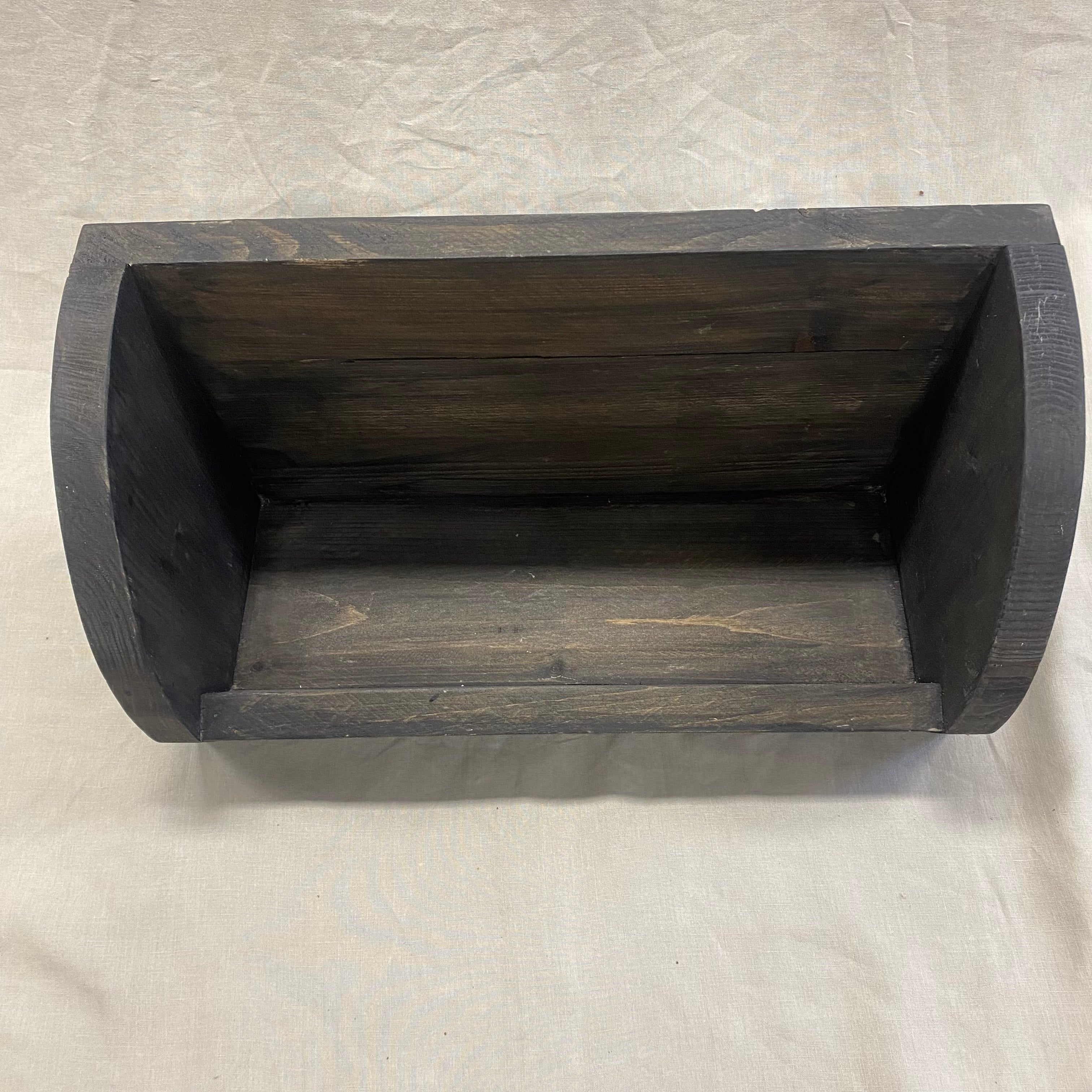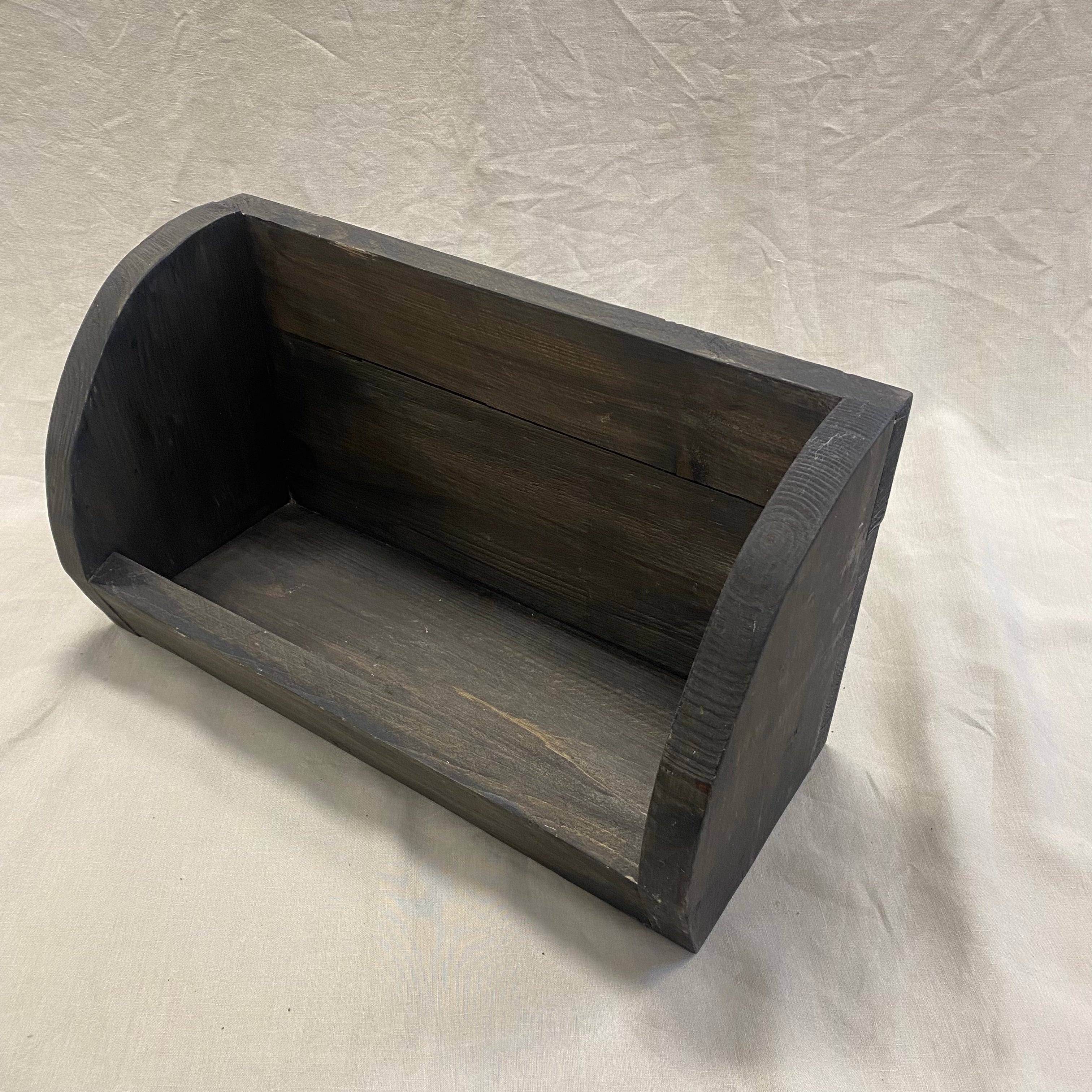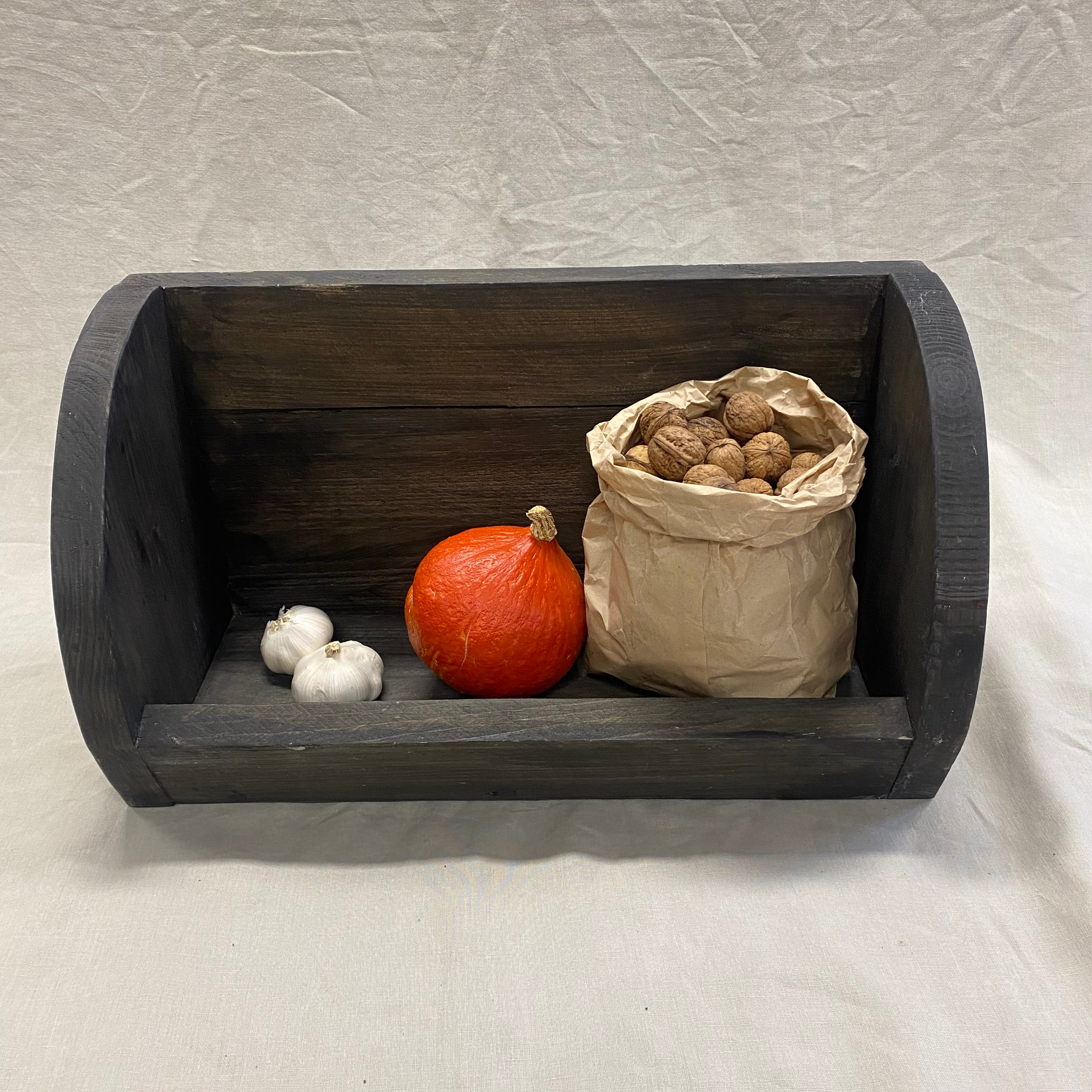 Een stoere, zwart houten gruttersbak met een robuuste en authentieke uitstraling. Perfect voor het organiseren van keukenspullen of als decoratief item met karakter.