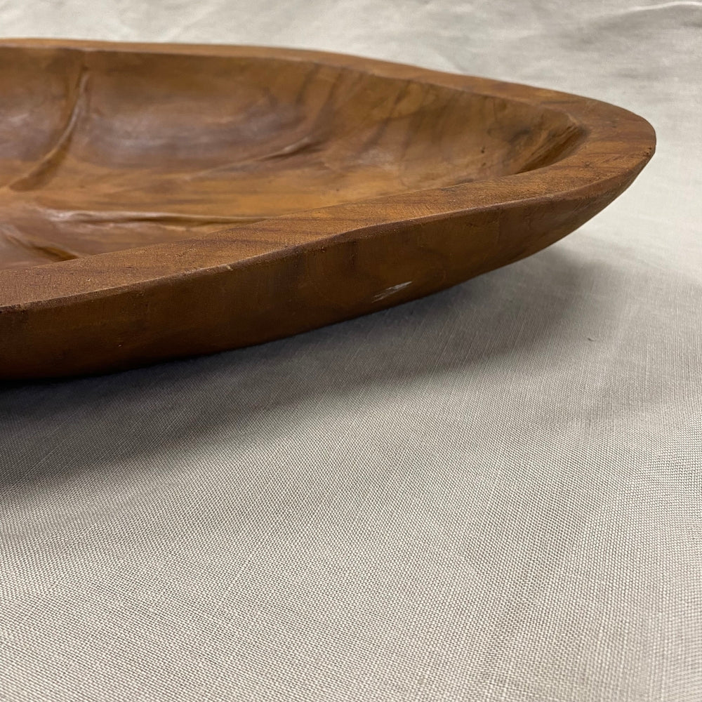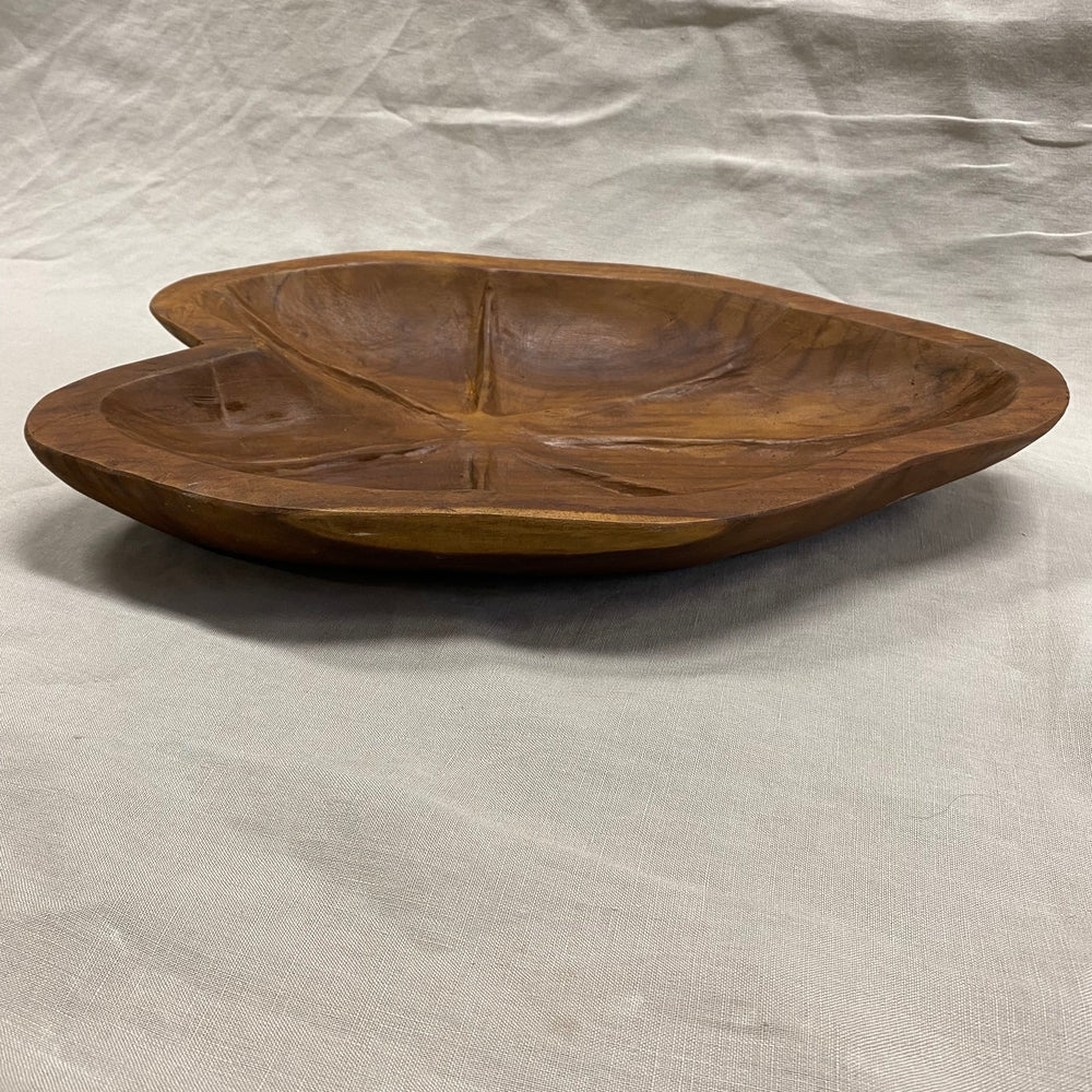Een handgemaakte teak houten schaal in de vorm van een blad. Natuurlijke elegantie met warme houttinten en organische lijnen, perfect voor een sfeervol interieur.
