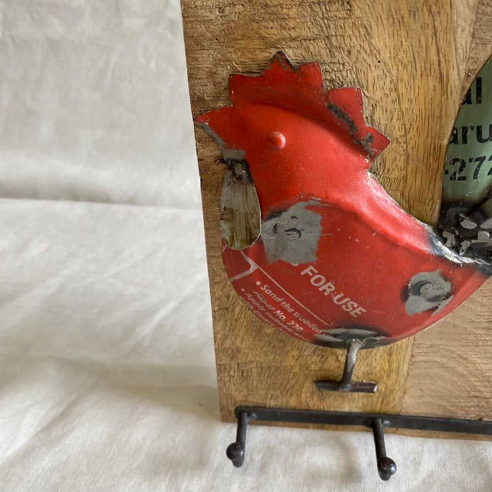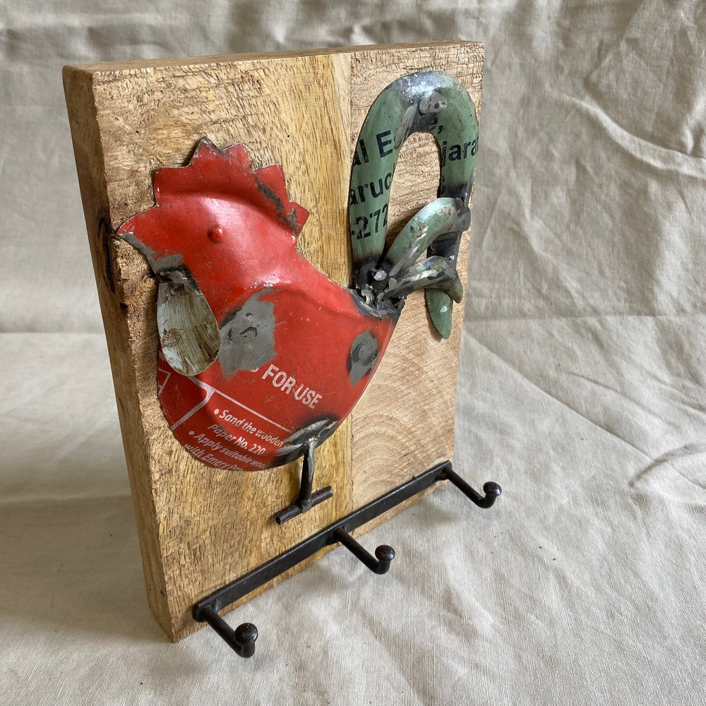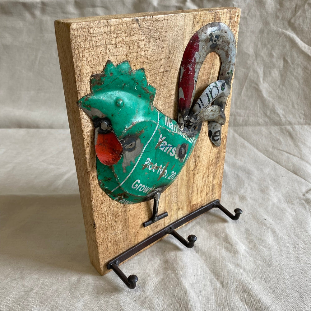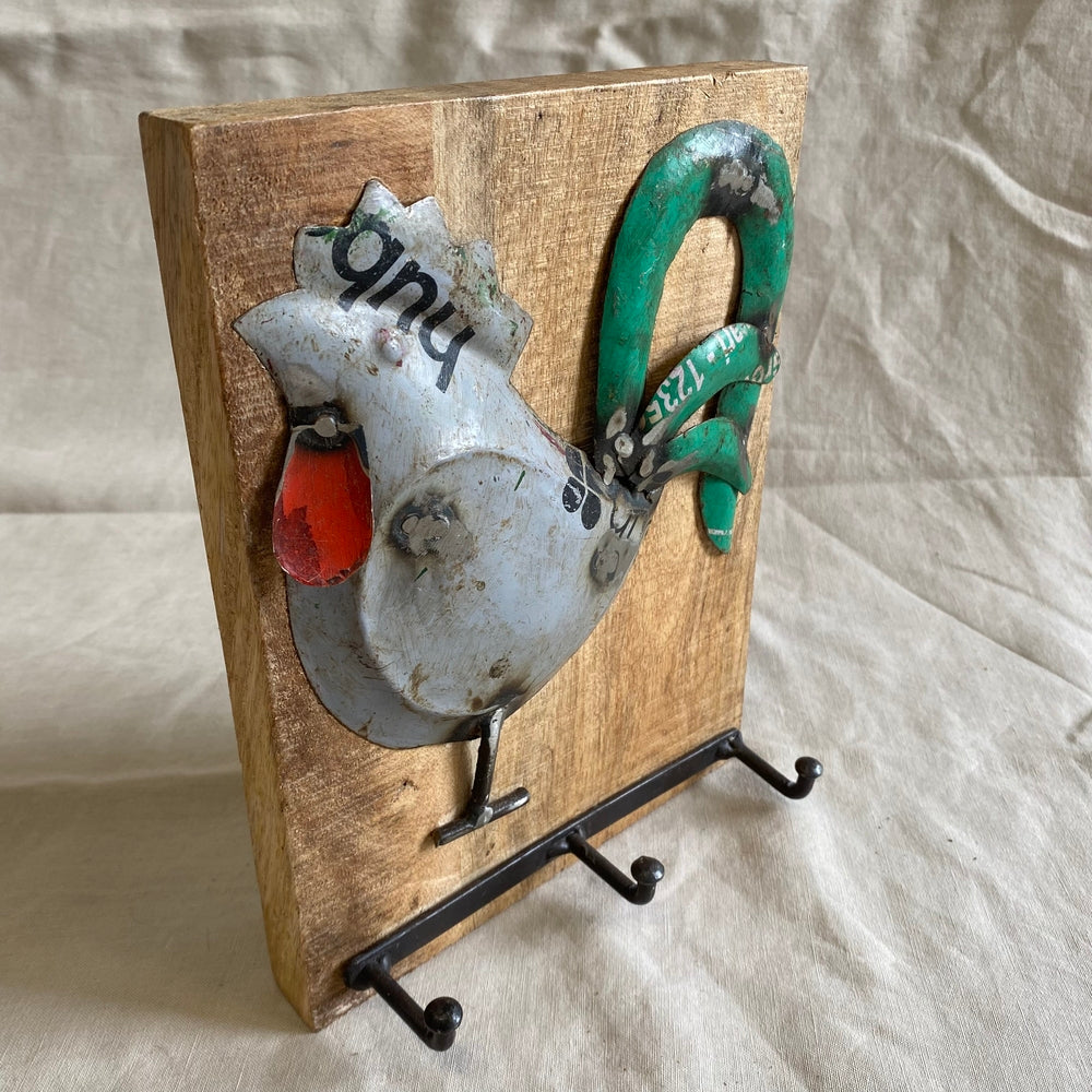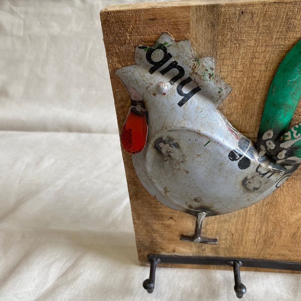 Kapstok met een vrolijke haan van gerecycled blik op een robuuste mangohouten plank. Praktisch en speels – een handgemaakt item met karakter en een knipoog.