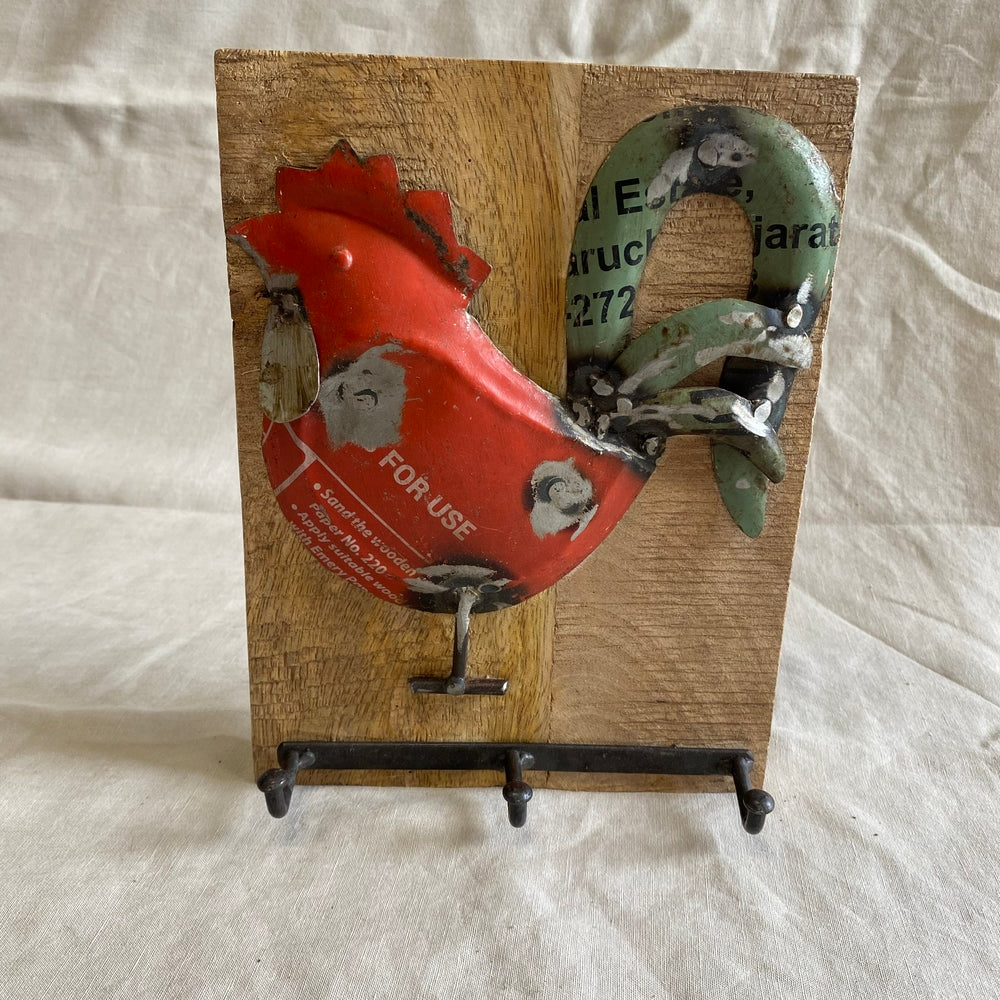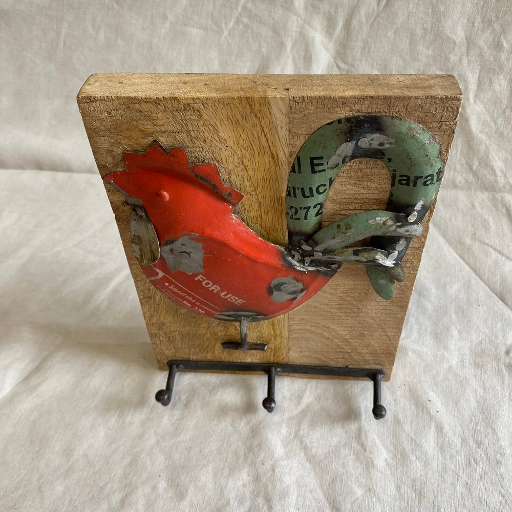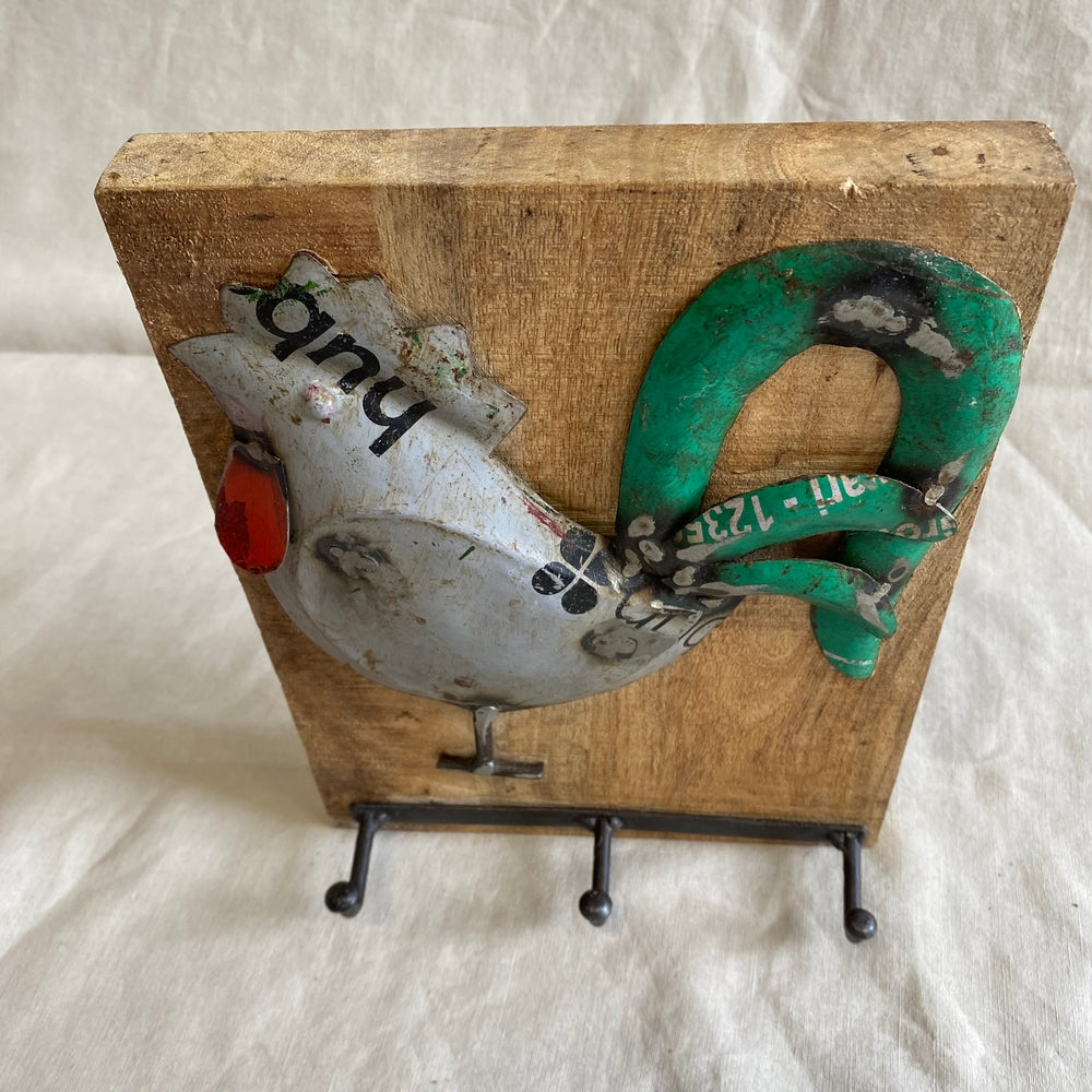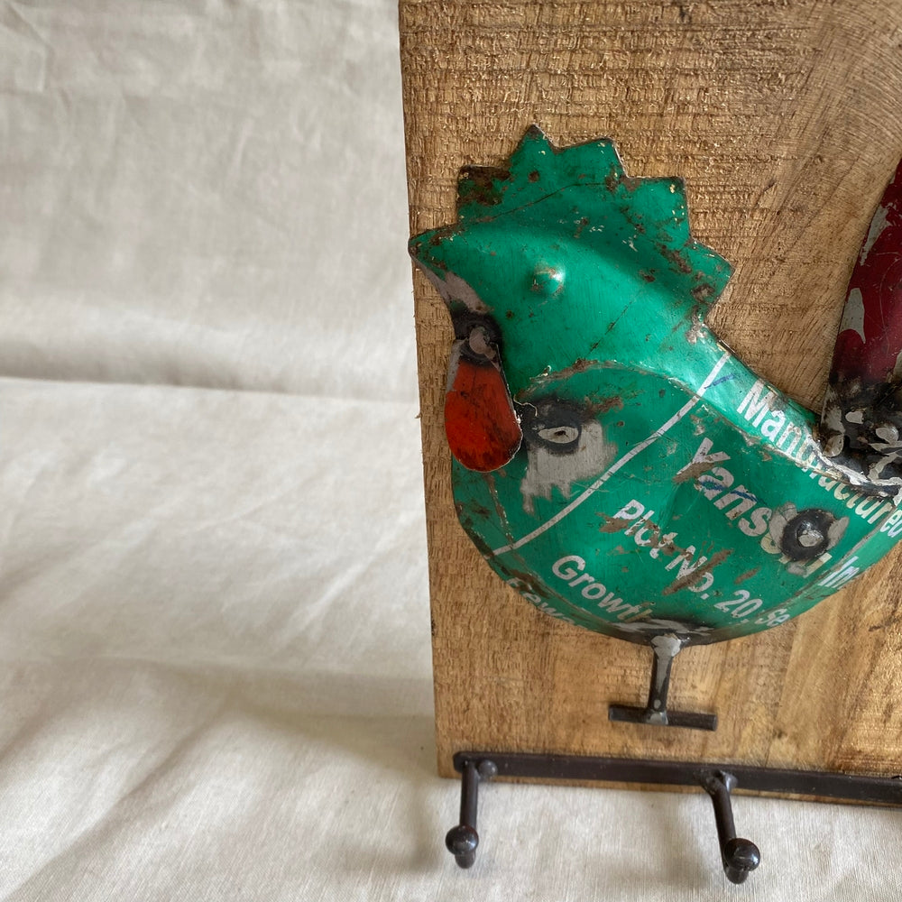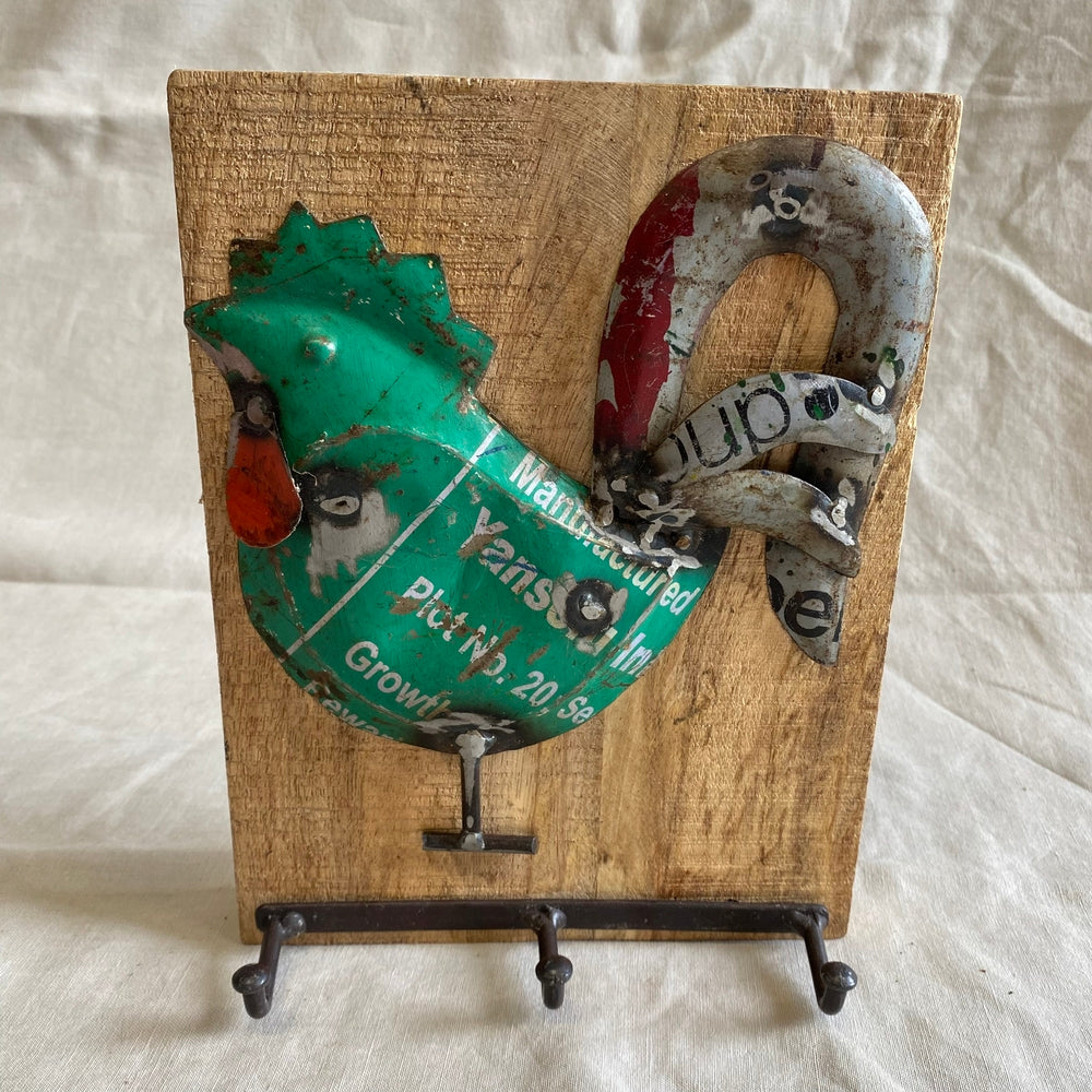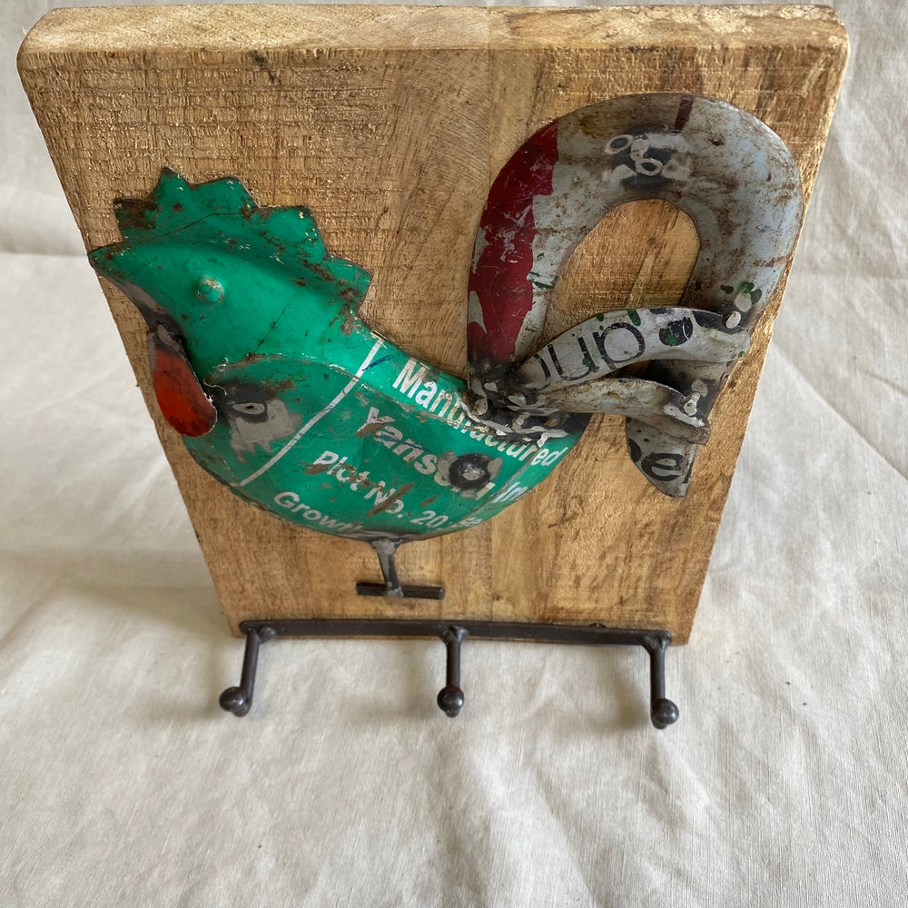 Kapstok met een vrolijke haan van gerecycled blik op een robuuste mangohouten plank. Praktisch en speels – een handgemaakt item met karakter en een knipoog.