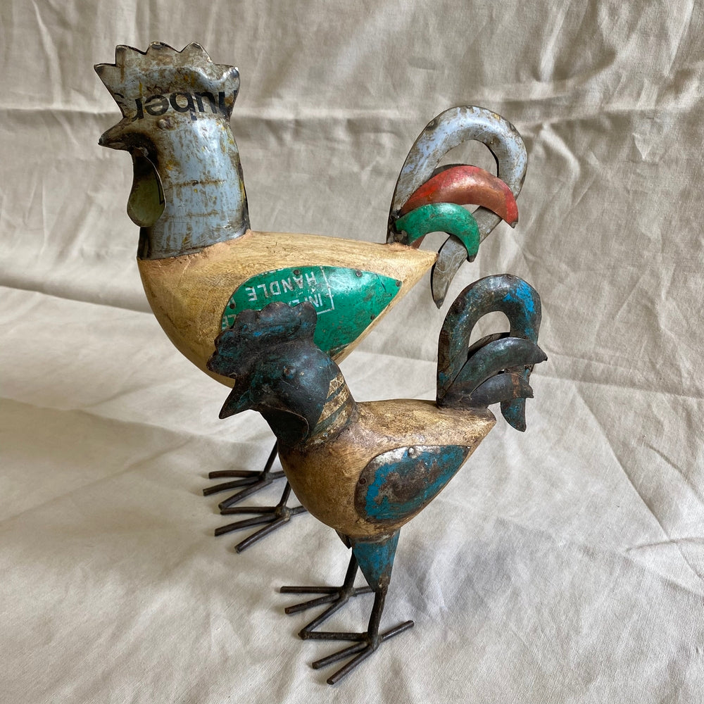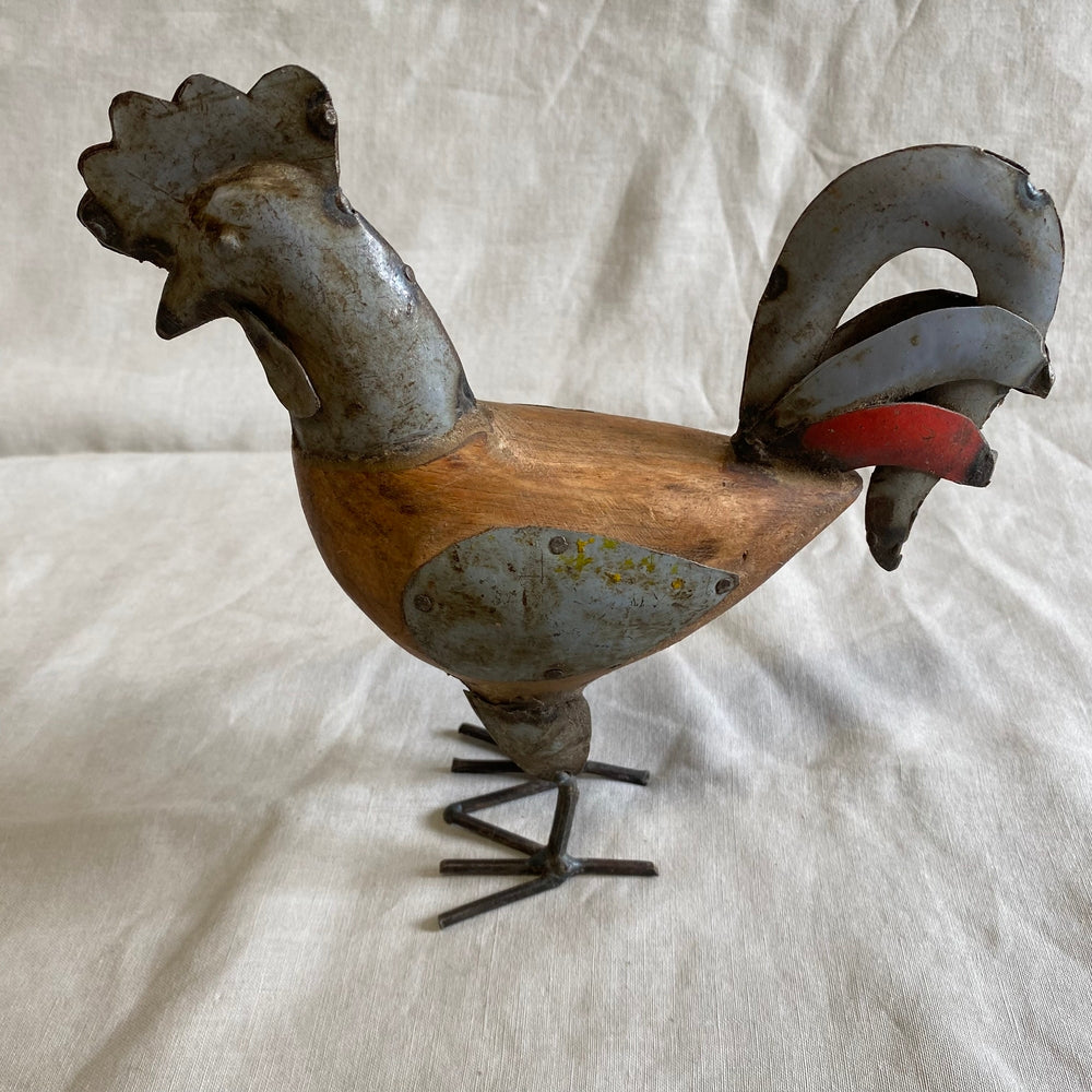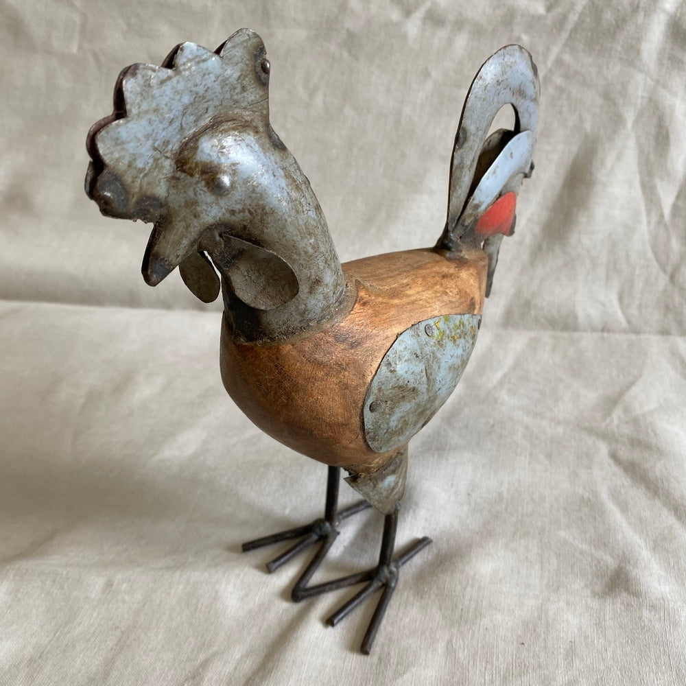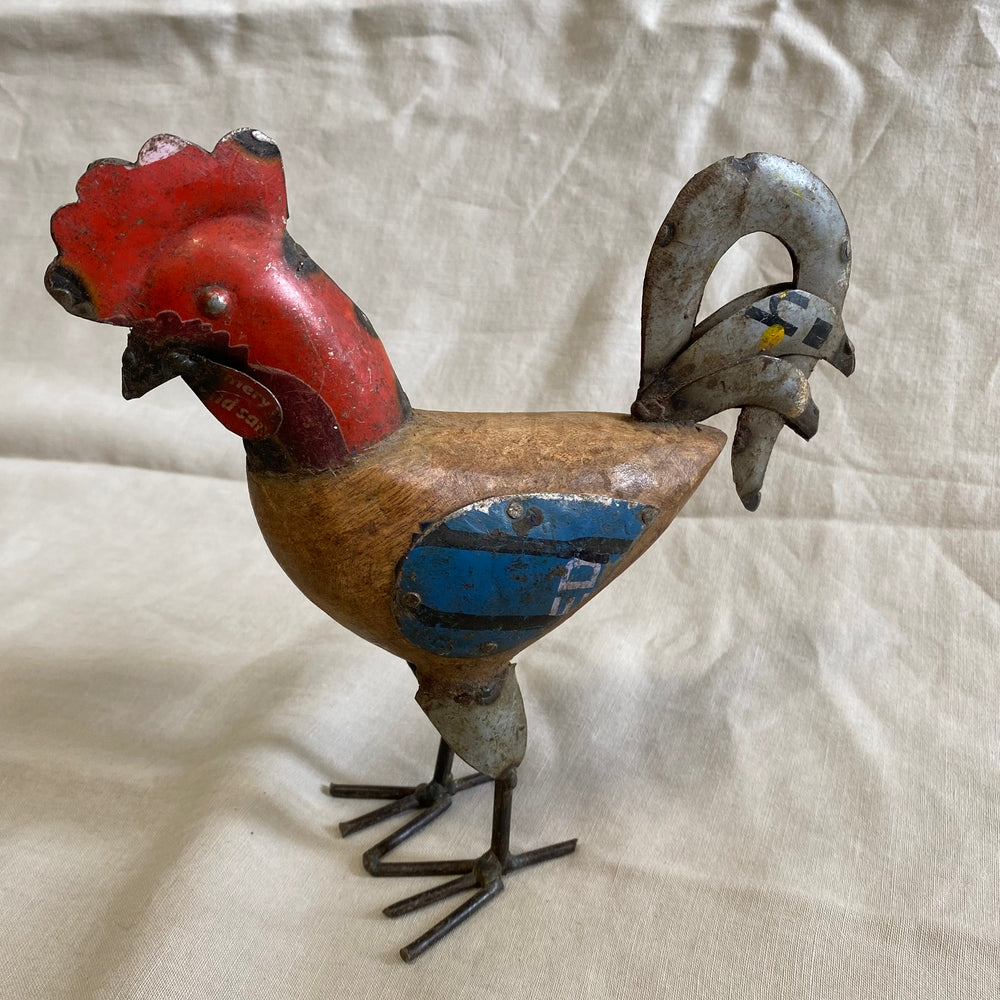 Een charmante kleine haan, handgemaakt van gerecycled blik en hout. Een speels detail met karakter, vol kleur en ambachtelijke eenvoud.