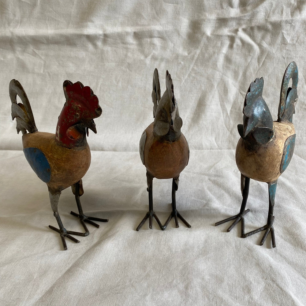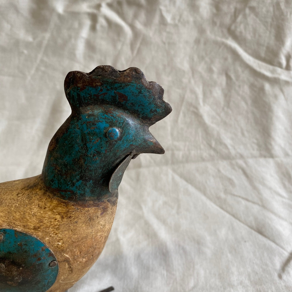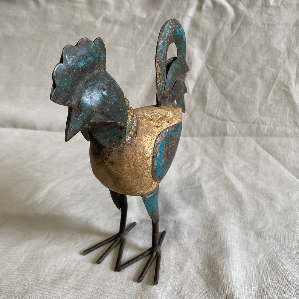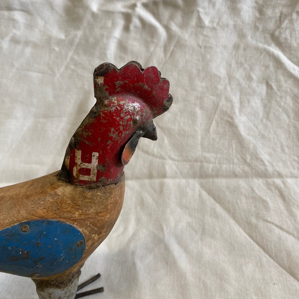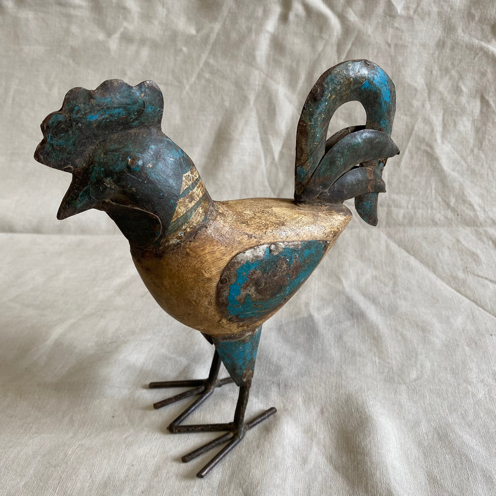 Een charmante kleine haan, handgemaakt van gerecycled blik en hout. Een speels detail met karakter, vol kleur en ambachtelijke eenvoud.