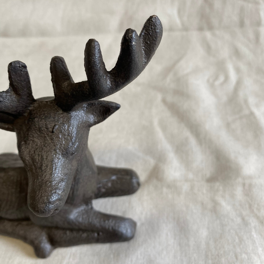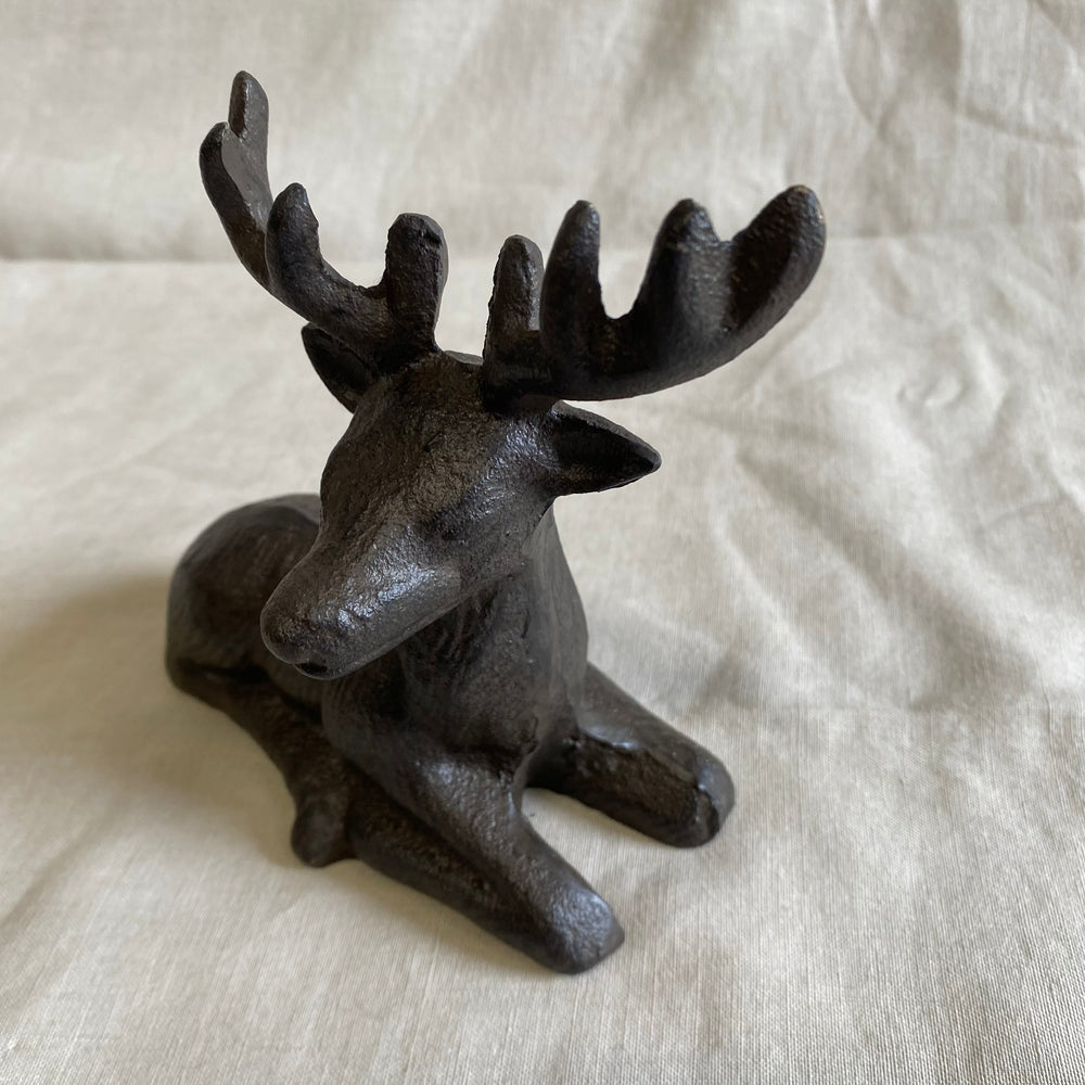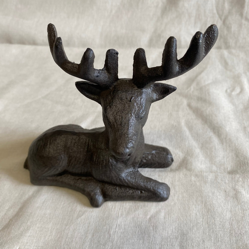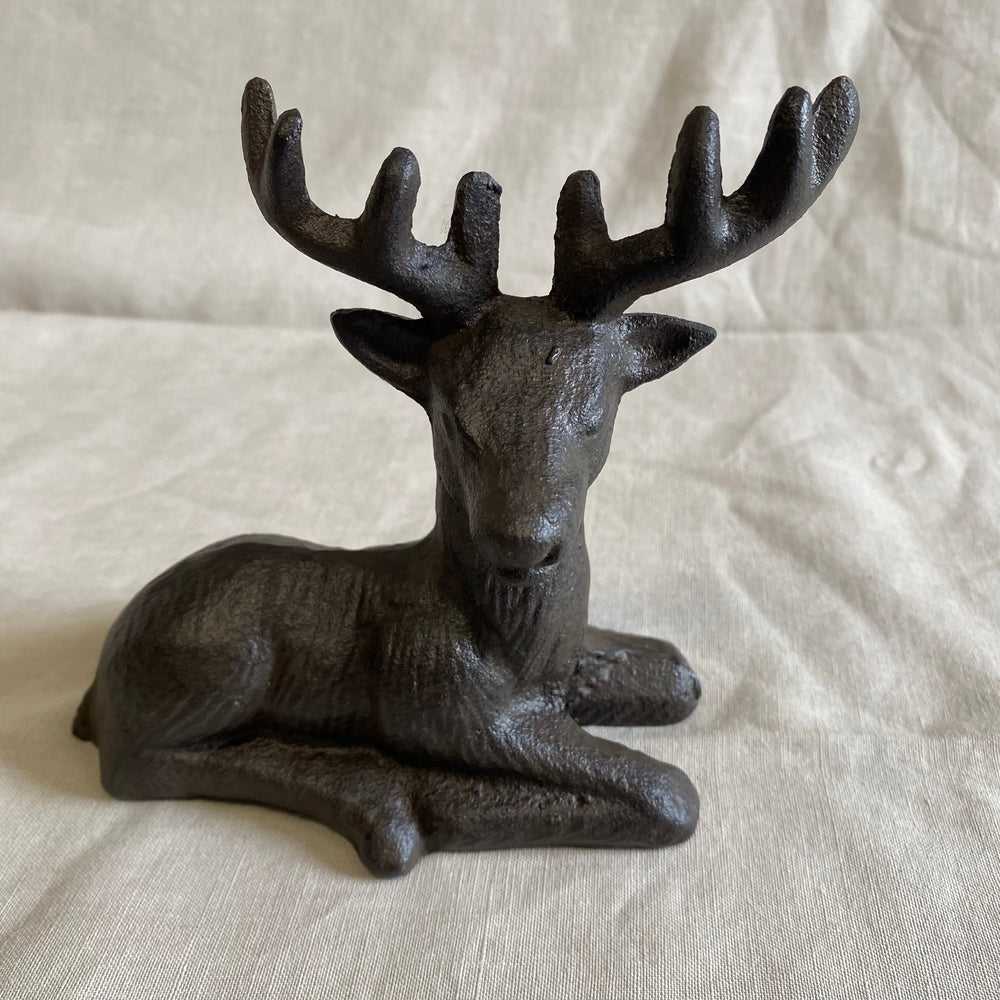 Een liggend hert van gietijzer, zwaar en sfeervol. Met zijn rustgevende houding en robuuste uitstraling een tijdloos accent voor binnen of buiten.