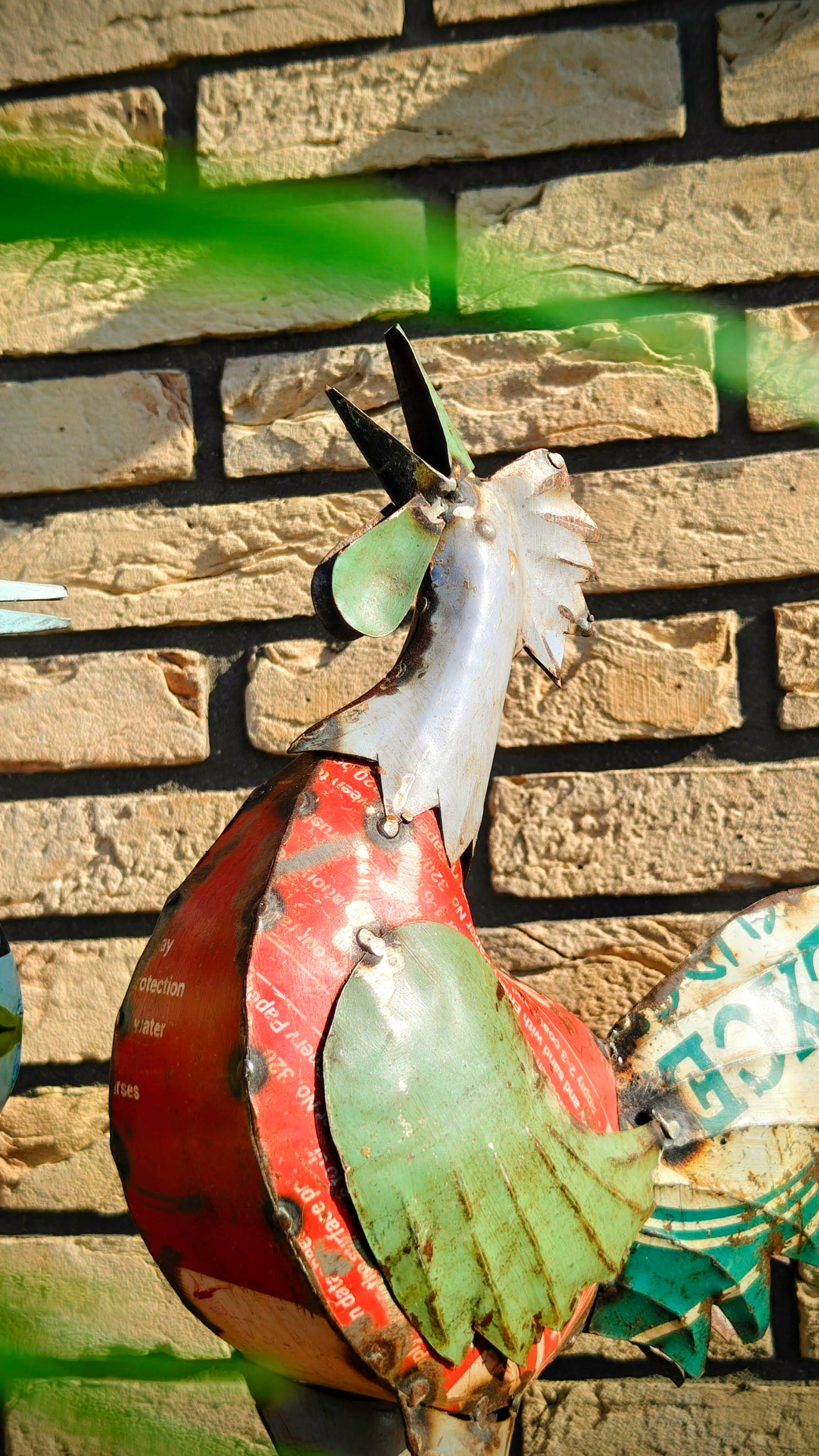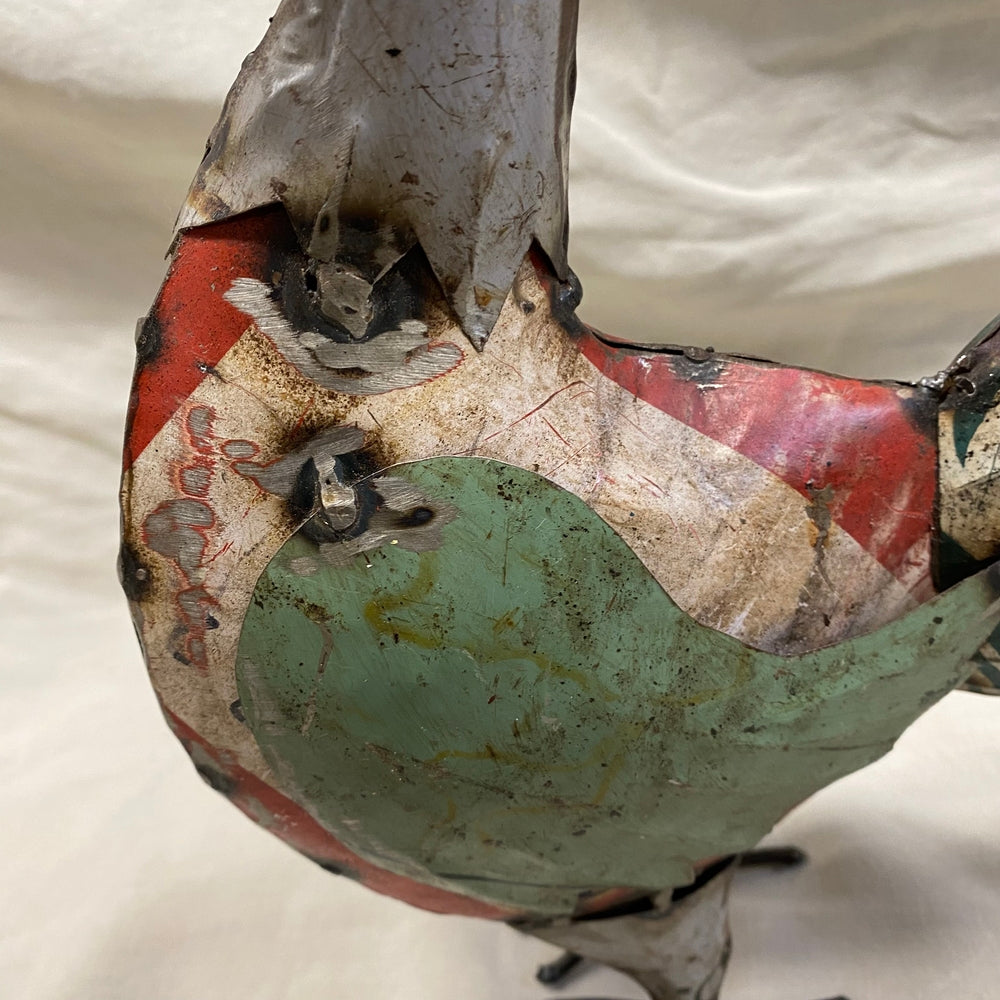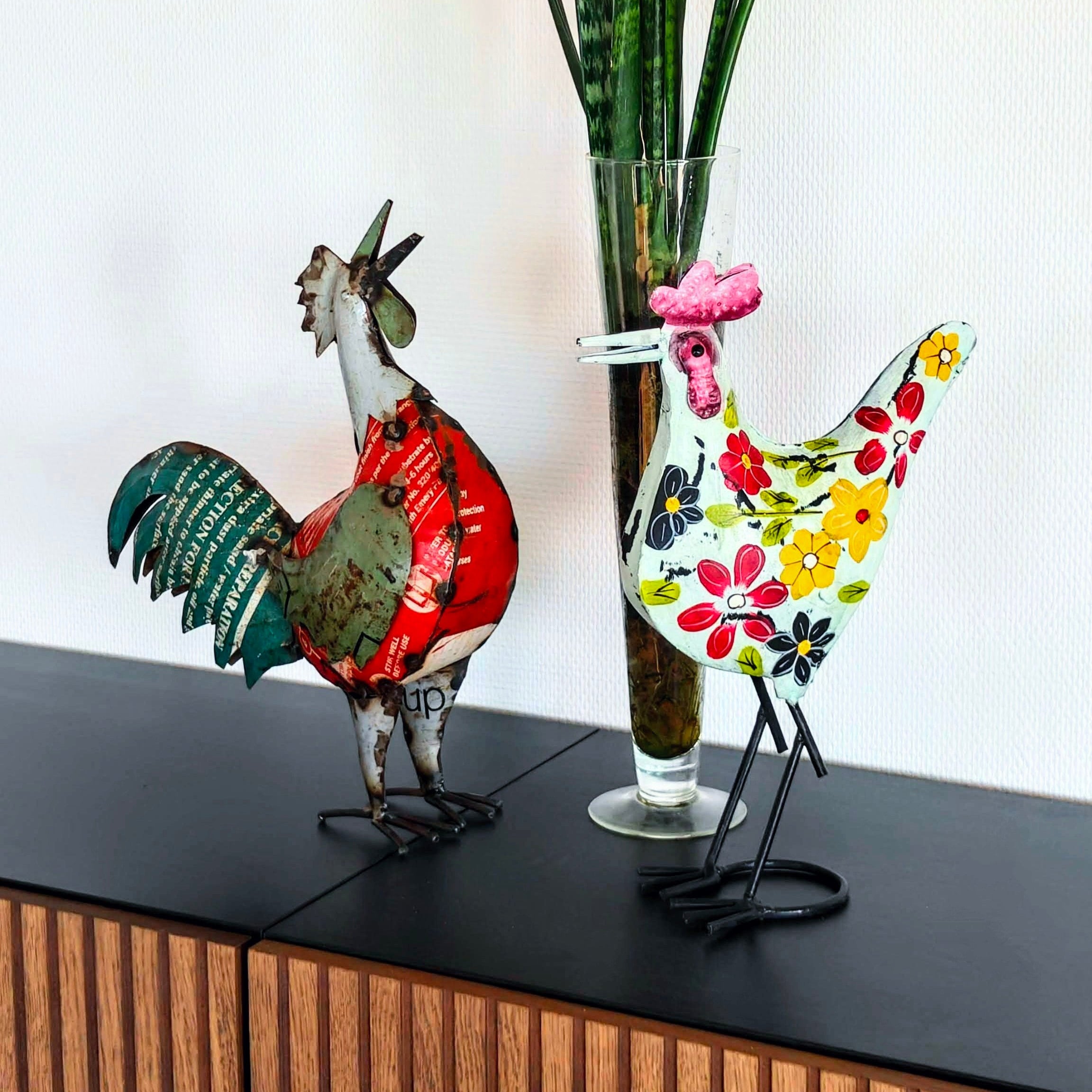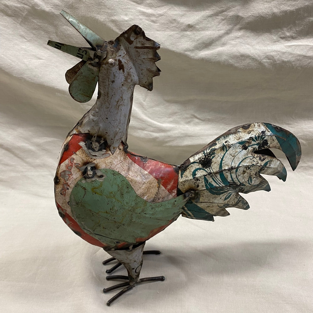 Een stoere metalen haan, gemaakt van gerecycled blik. Handgemaakt en uniek, met een robuuste en karaktervolle uitstraling.