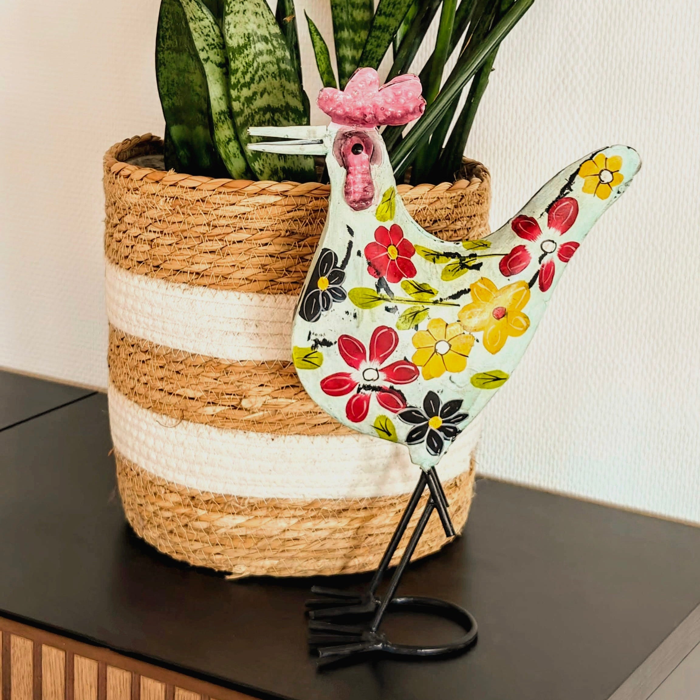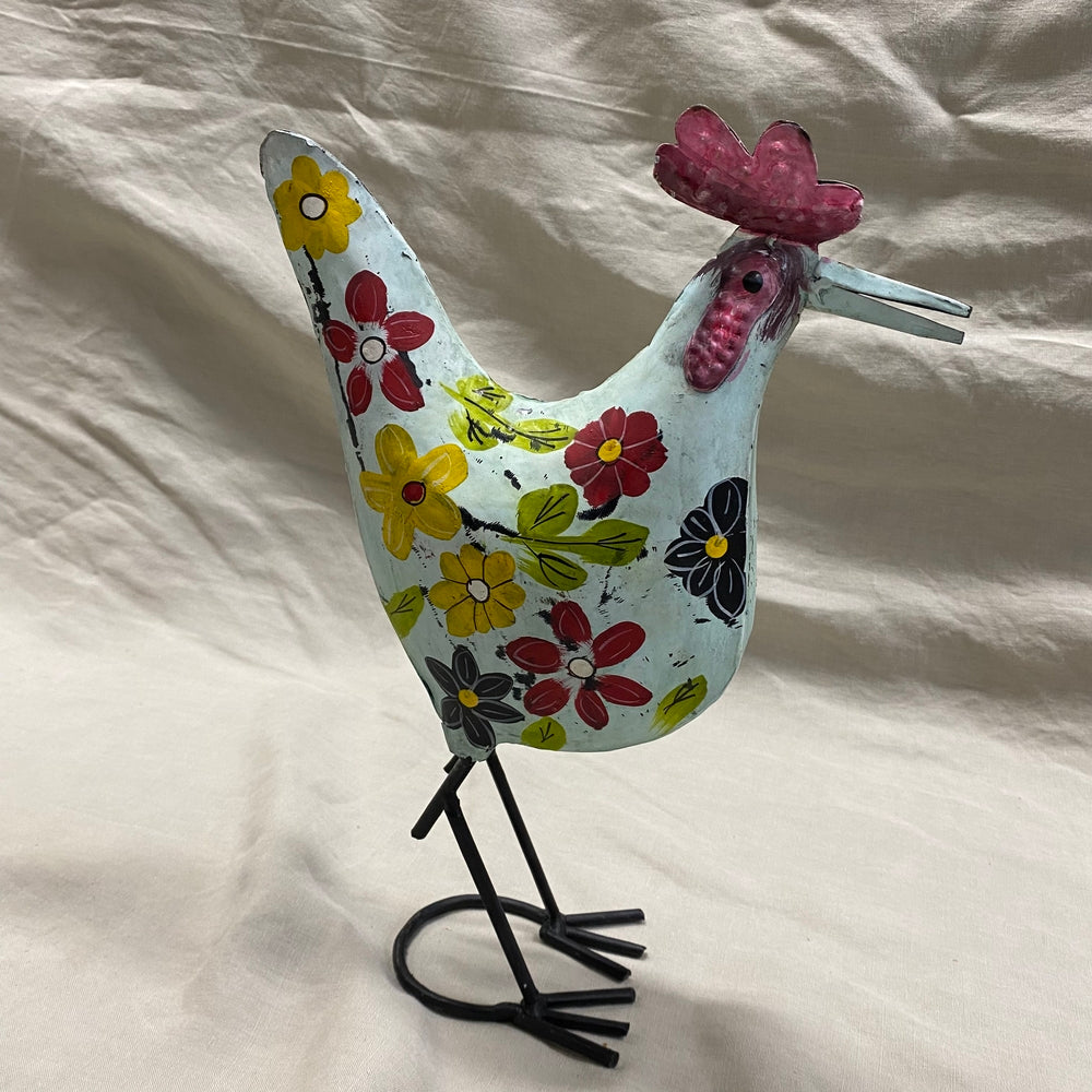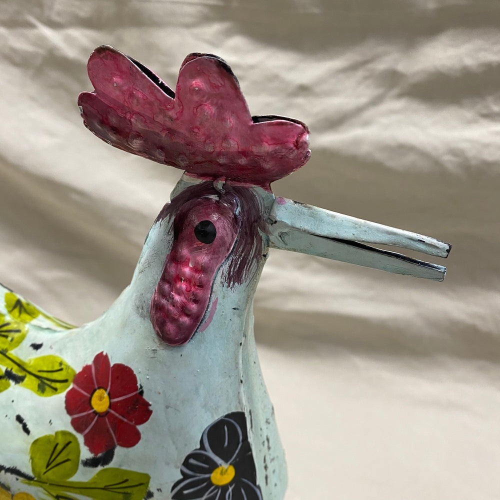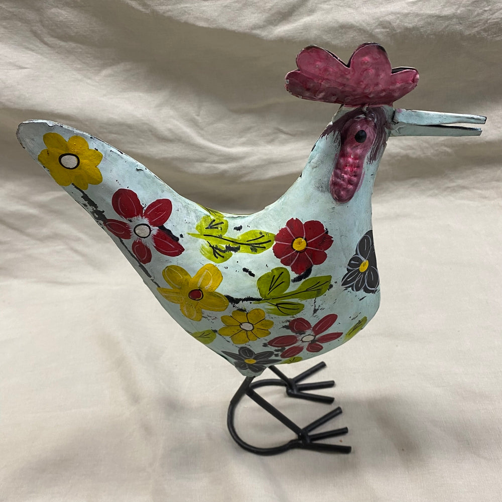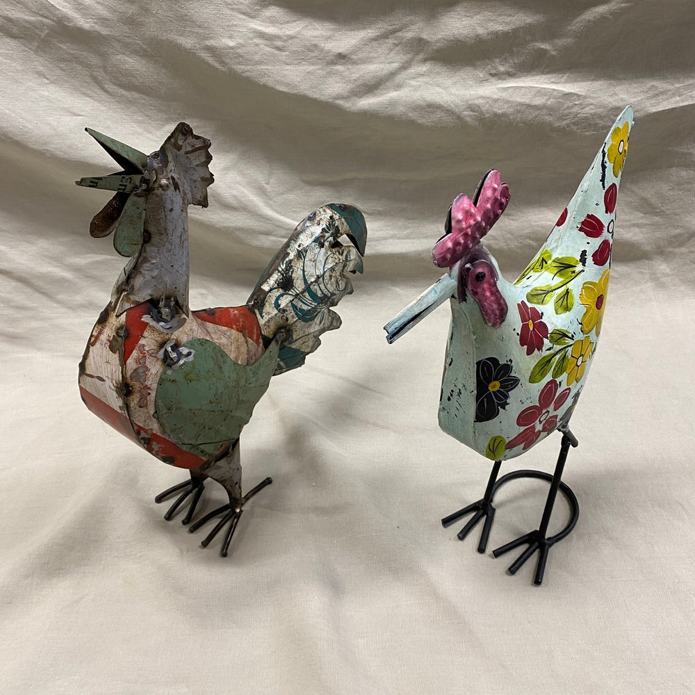 Een stoere metalen haan, gemaakt van gerecycled blik. Handgemaakt en uniek, met een robuuste en karaktervolle uitstraling.