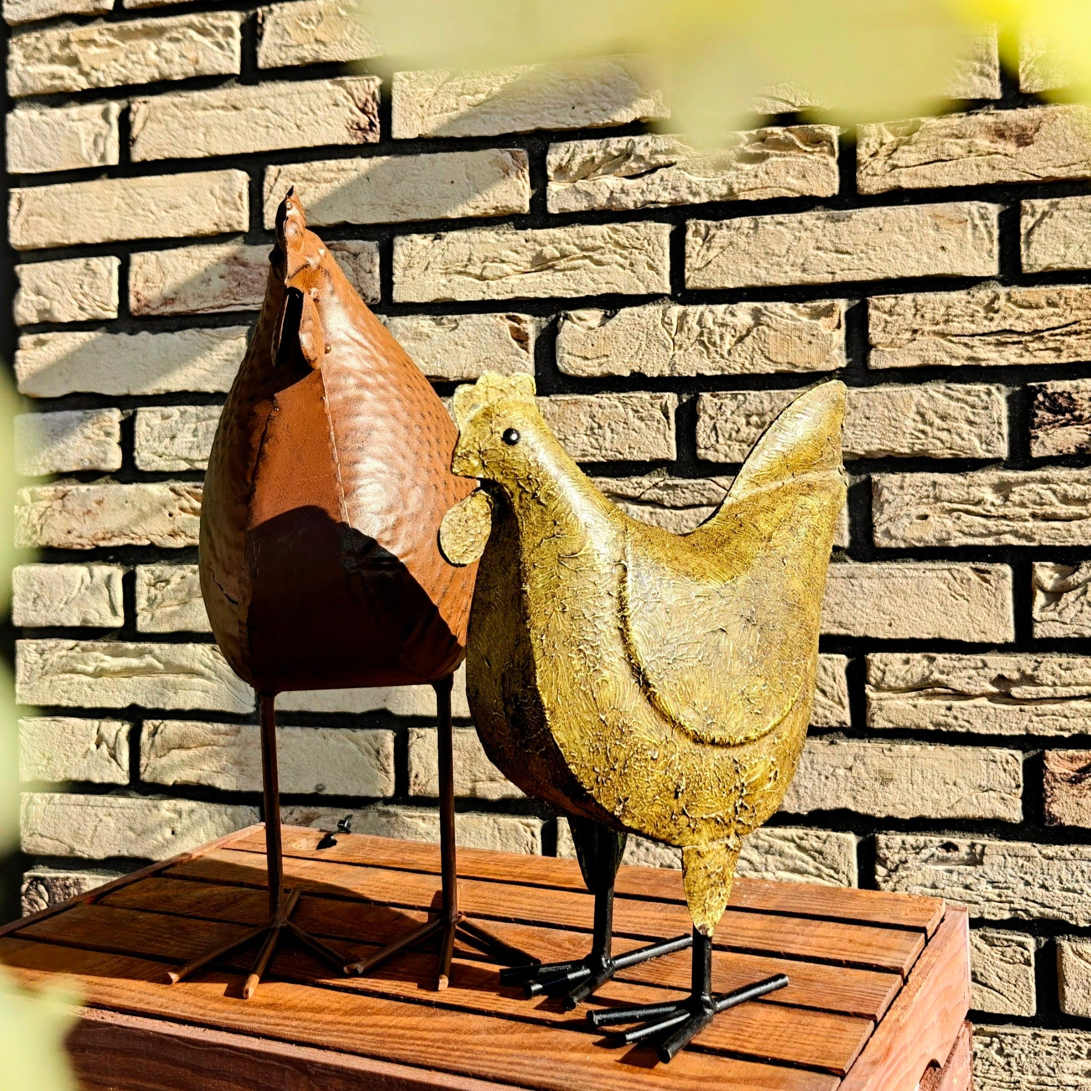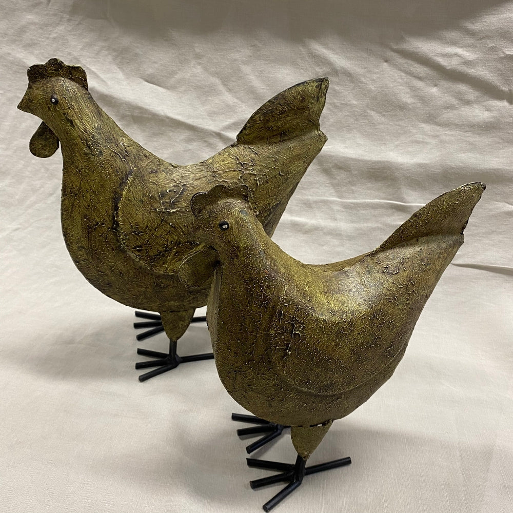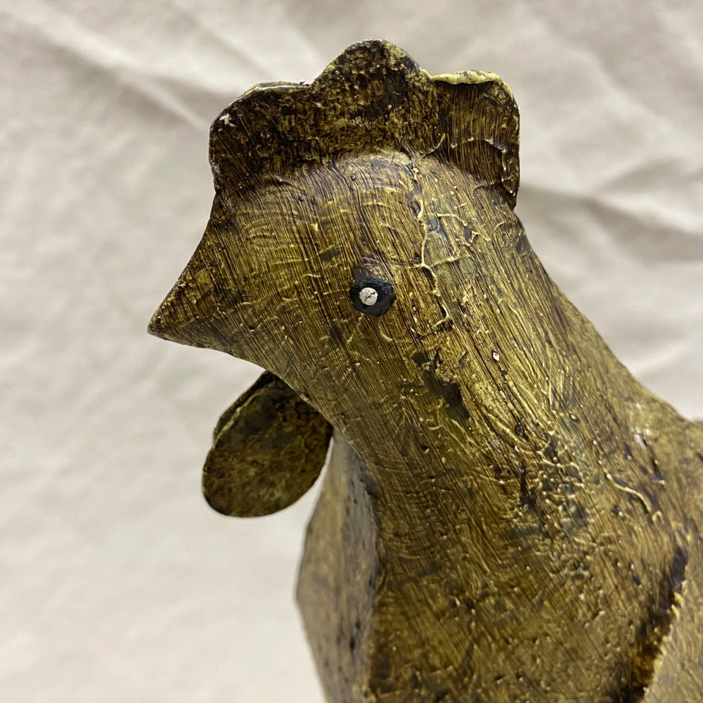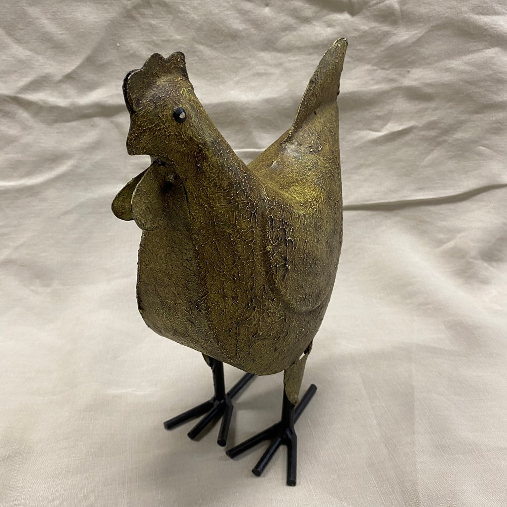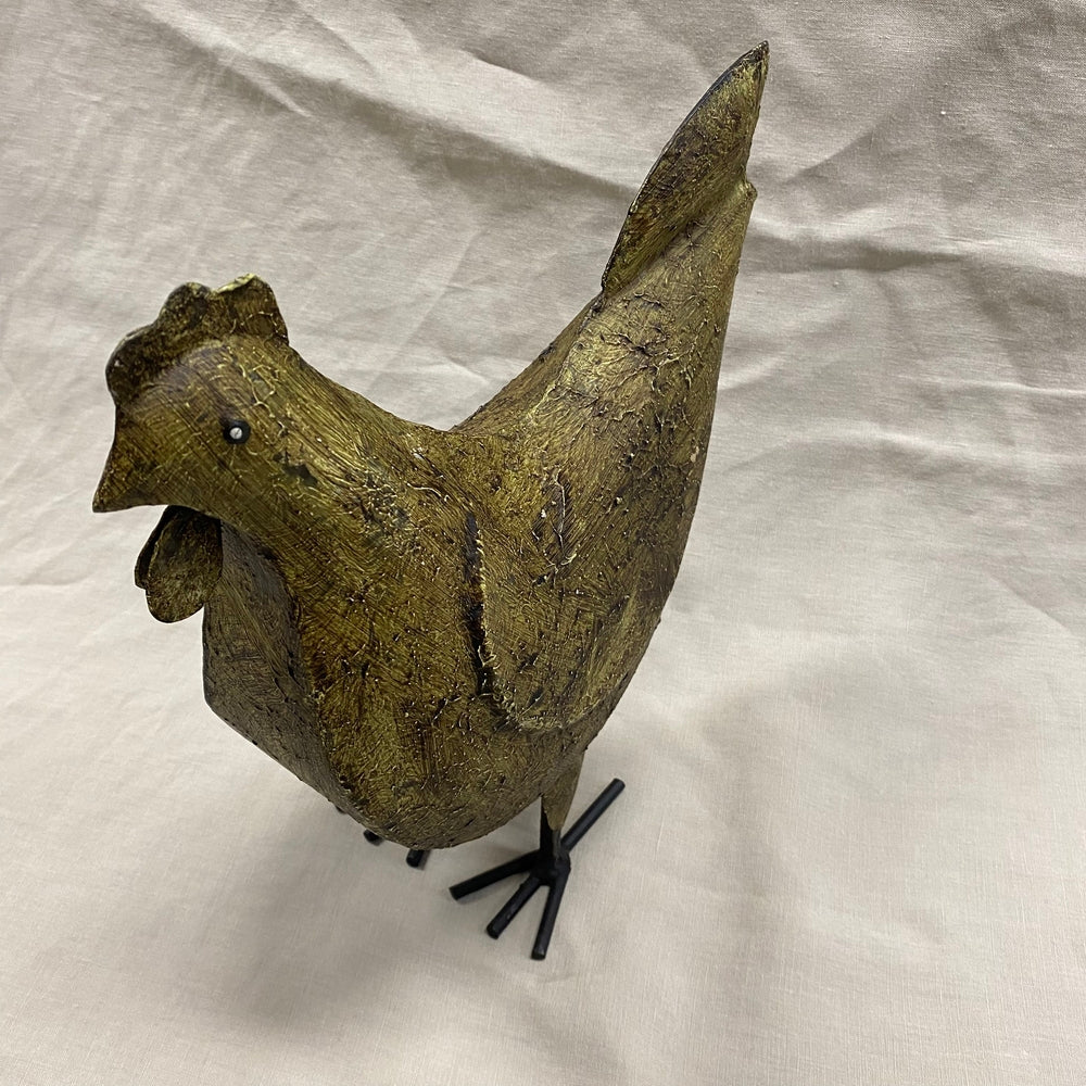 Een karaktervolle, roestbruine metalen kip. Handgemaakt met een robuuste uitstraling – een speels en uniek detail voor binnen of buiten.