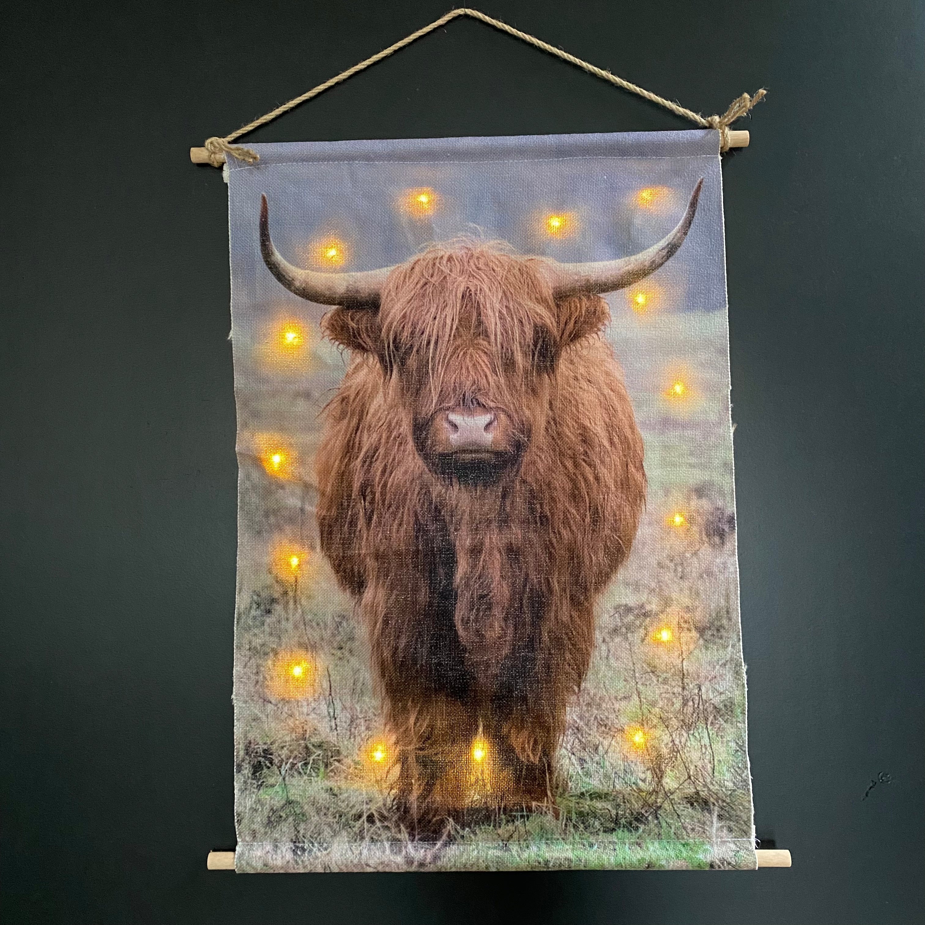 Laat je muur oplichten met karakter: onze Schotse hooglander wanddecoratie met ingebedde LED-verlichting. Een prachtig stuk voor liefhebbers van stoere en sfeervolle interieurs.
