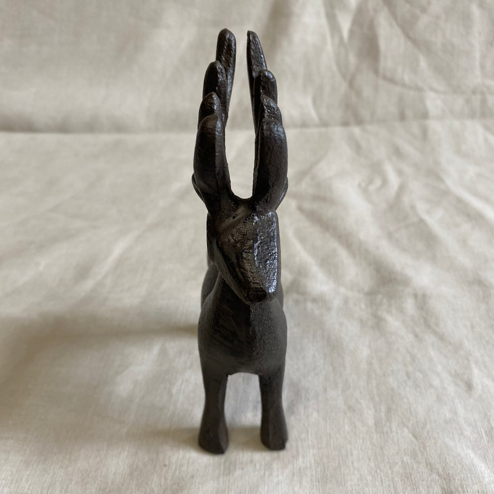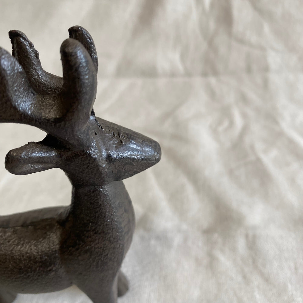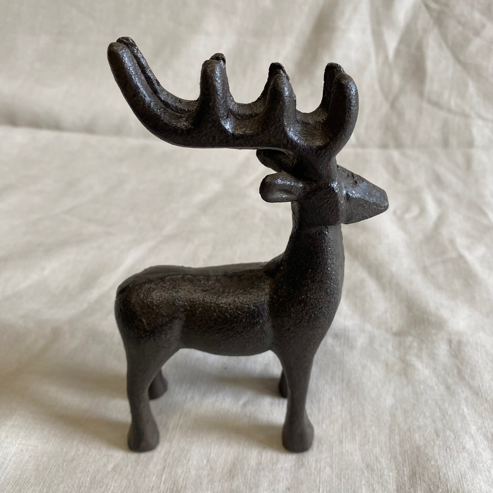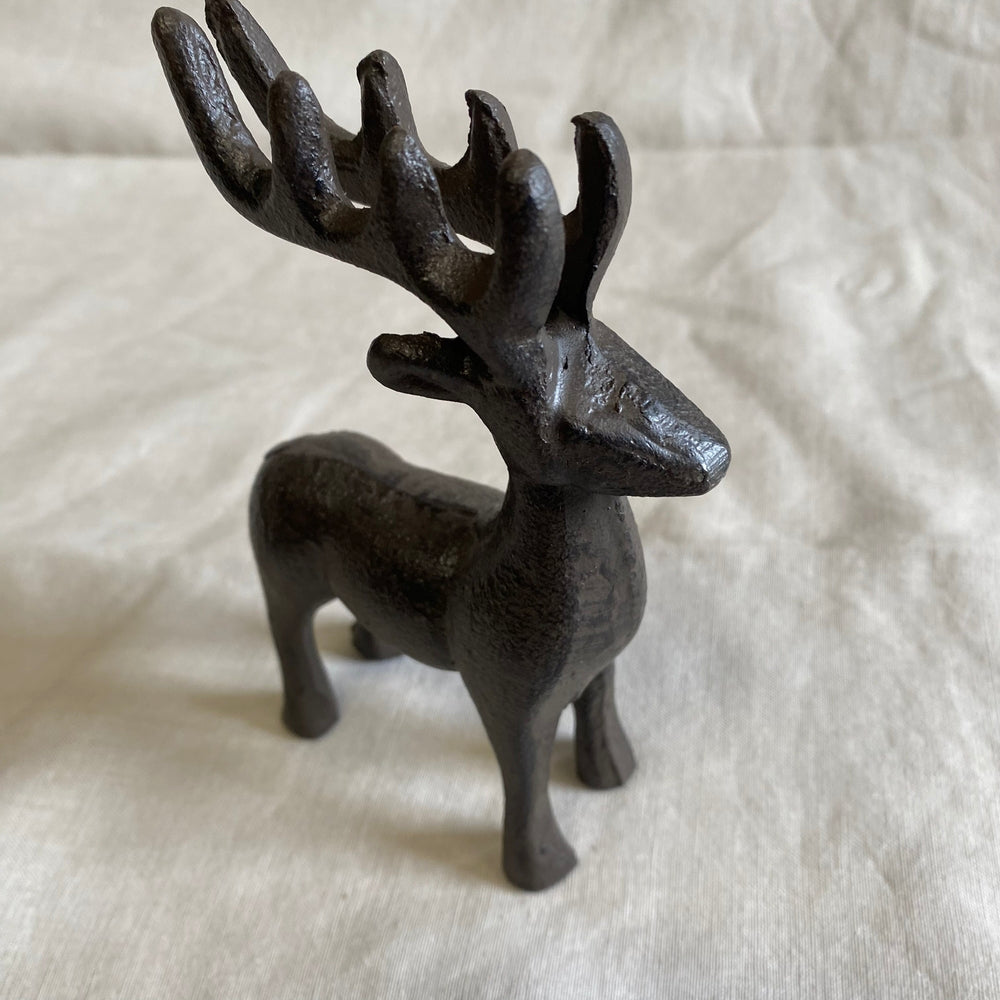 Een staand hert van gietijzer, zwaar en sfeervol. Met zijn rustgevende houding en robuuste uitstraling een tijdloos accent voor binnen of buiten.
