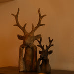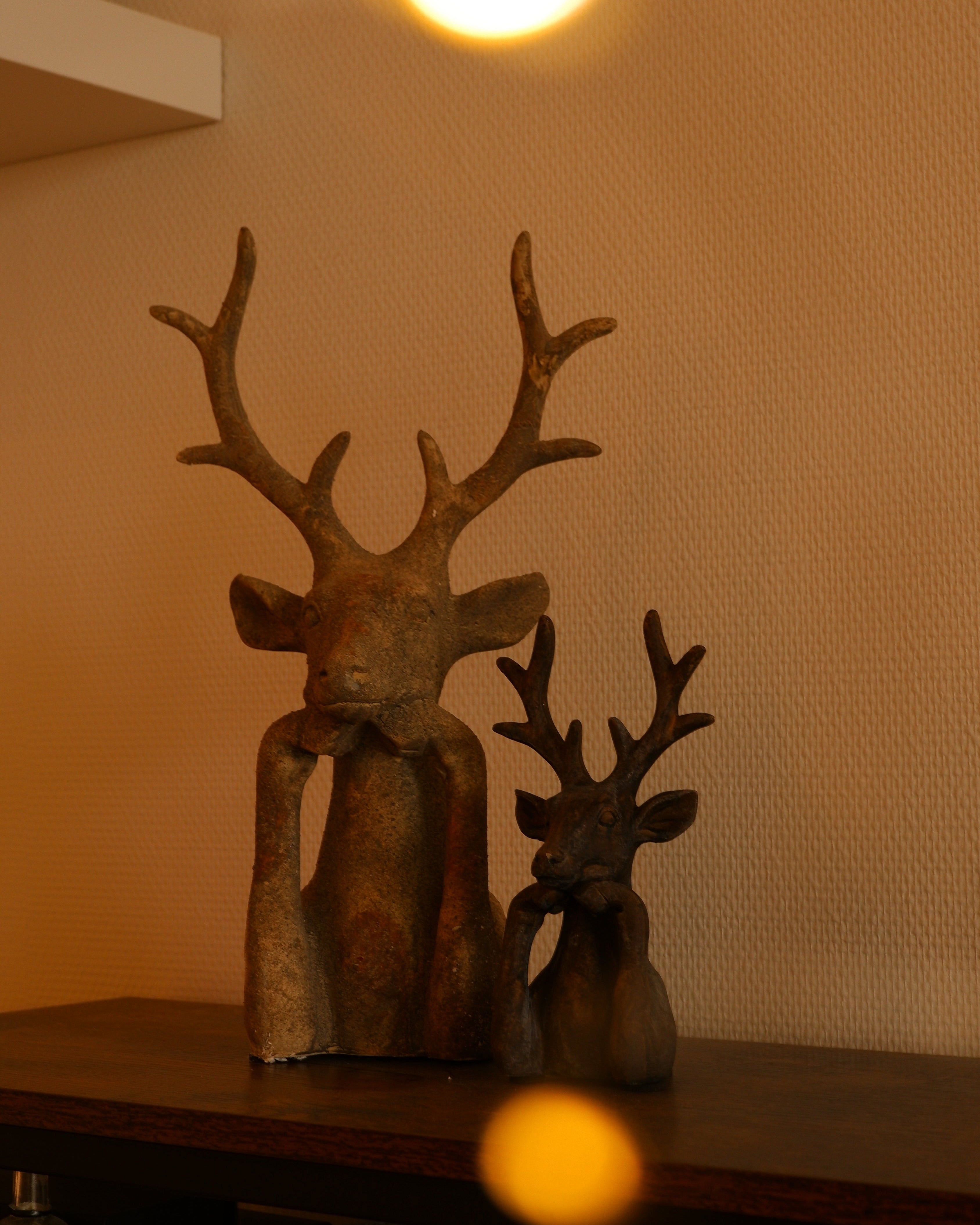 Dit hertenhoofd van steen, met z’n poten onder de kin, is een subtiele blikvanger met een warme, serene uitstraling.