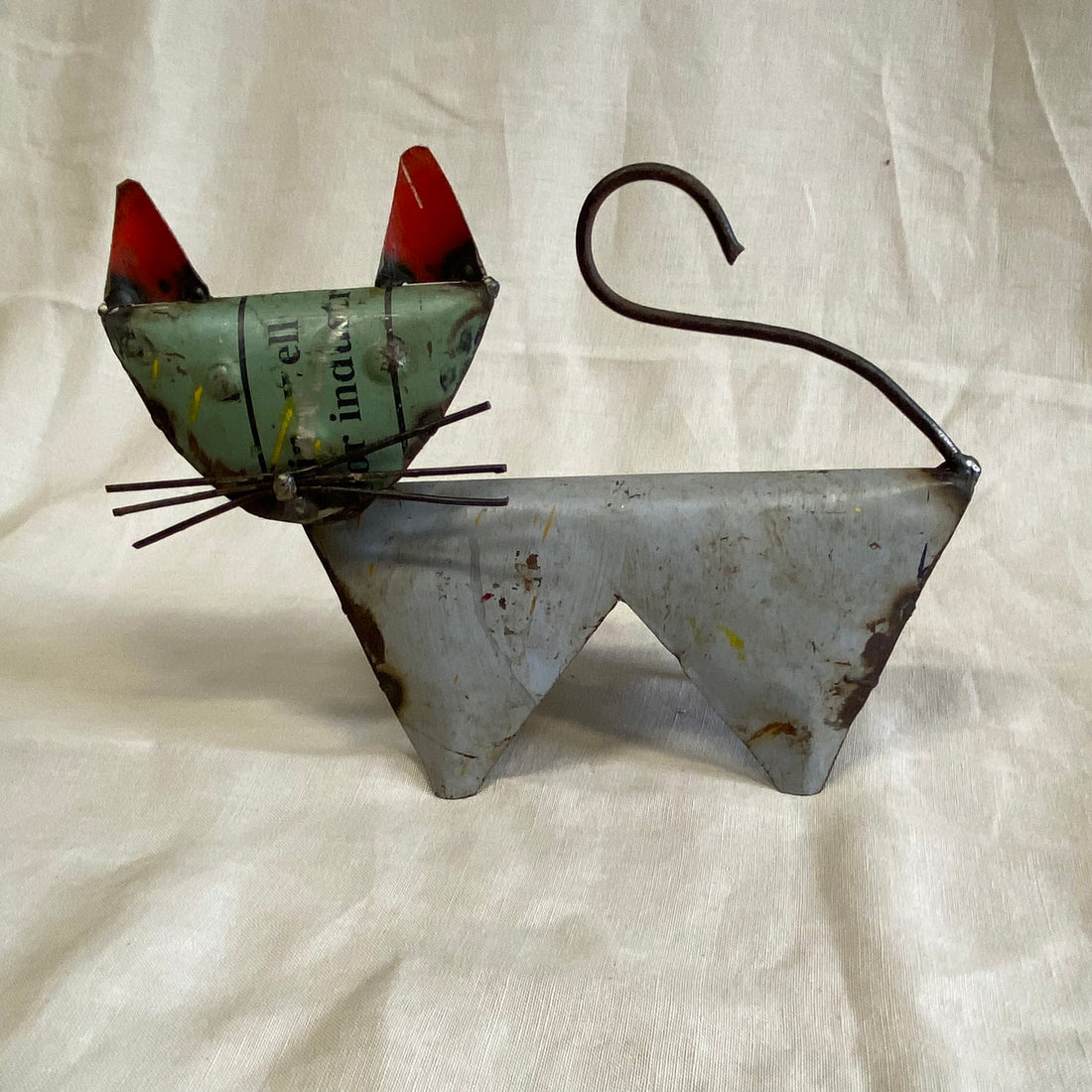 Een speelse poes van gerecycled blik, handgemaakt en vol karakter. Kleurrijk, uniek en met een knipoog – een vrolijke toevoeging aan elk interieur.